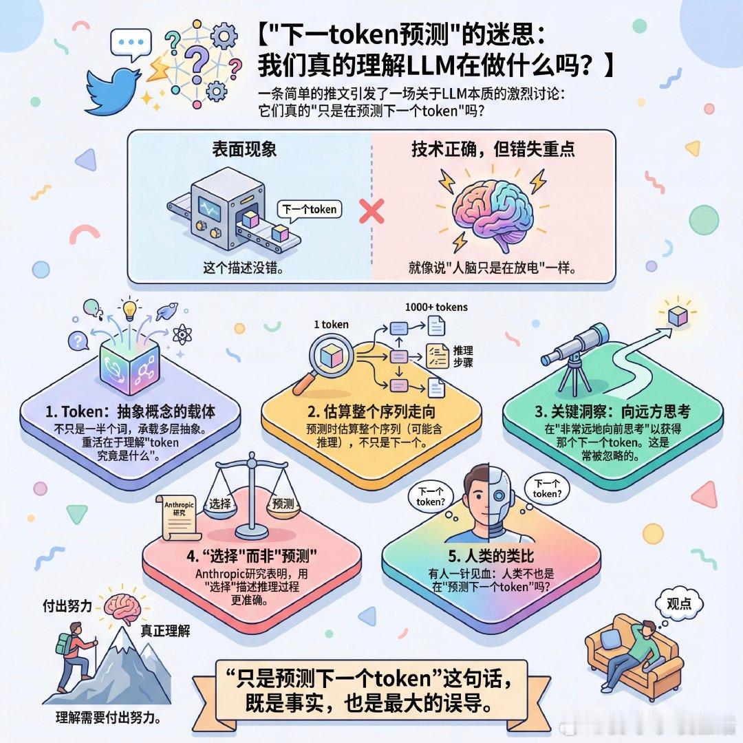 【"下一token预测”的迷思:我们真的理解LLM在做什么吗?】一条简单的推文引发了一场关于LLM本质的激烈讨论:它们真的"只是在预测下一个token"吗?表面上看,这个描述没错。但这种说法就像说"人脑只是在放电"一样,技术上正确,却完全错失了重点。几个值得深思的视角:1. Token不只是一半个词,而是承载着多层抽象概念的载体。真正的重活在于理解"token究竟是什么"。2. 预测下一个token时,模型其实在估算整个序列的最可能走向——可能是1个token,也可能是1000个,可能包含推理步骤,也可能不包含。3. 关键洞察:它们在"非常远地向前思考"以获得那个下一个token。这才是大多数人忽略的地方。4. Anthropic今年早些时候的诗歌规划研究表明,用"选择"而非"预测"来描述推理过程更为准确。5. 有人一针见血:人类不也是在"预测下一个token"吗?理解需要付出努力。当我们回避这种努力时,观点就会取代学习。如果不去真正理解AI的运作方式,我们就只能依赖他人的说法,无法分辨真伪。"只是预测下一个token"这句话,既是事实,也是最大的误导。x.com/ZachWarunek/status/2006520699444510890