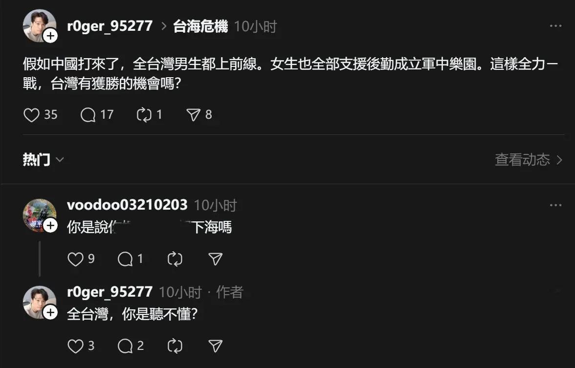一名台独分子提议: 如果大陆打进来,全台湾男生上前线,所有女生也应该尽力支援而成立“军中乐园”。如此全力一战的话,台湾有获胜的机会吗? 这话说的,真是让人又气又笑,背后还发凉。气的是,这人完全没把台湾普通老百姓当人看,在他的算盘里,男女都成了可以随意消耗的“工具”和“资源”,为了他那套虚幻的“台独”梦,竟然盘算着把所有人都推向火坑。笑的是,这种想法幼稚得可怕,纯粹是坐在井里说大话,完全不知道现代战争是什么样子。 还“全台男生上前线”?知道现代战争怎么打吗?早就不是靠人海战术挤上去拼刺刀的时代了。那是体系对体系的对抗,是制空权、制海权、信息权的全面争夺。真到了那一步,还没等你看到对方士兵的脸,关键节点可能就已经被精准拔除了。把没有经过严格训练的普通人送上战场,那不是英勇,那是送死,是对生命极度的不负责任。 更恶心的是,竟然还提出让女性成立什么“军中乐园”。这词本身就是对女性的极大侮辱,是把人当成泄欲工具,是赤裸裸的、倒退到野蛮时代的想法。这哪里是什么“保卫家园”,这分明是要把整个社会拖入黑暗的深渊,用践踏基本人伦和尊严的方式,来为一个注定失败的幻梦陪葬。提出这种想法的人,其心可诛,根本不配谈什么“未来”和“胜利”。 他问“有获胜的机会吗?”这根本就是一个伪问题。问题的前提就错了。首先,大陆方面反复强调,愿以最大诚意、尽最大努力争取和平统一的前景。我们针对的是极少数“台独”分裂分子及其分裂活动,绝不是台湾同胞。把两岸推向战争边缘的,正是这些不断挑衅的“台独”势力。其次,如果“台独”分裂势力真的误判形势,触碰了《反分裂国家法》的红线,逼迫国家采取断然措施,那么以两岸综合实力的巨大差距,结果是非常明确的。这根本不是“有没有机会”的问题,而是“螳臂当车”必然的结局。 这种言论的可怕之处在于,它用极端荒谬的设想,来绑架所有台湾民众,试图营造一种“悲情反抗”的假象。实际上,这是最自私、最不负责任的“台独”毒瘾发作时的疯话。真正的爱台湾,是避免战争,维护台海和平稳定,让老百姓过安稳日子,而不是挖空心思琢磨怎么让所有人给自己陪葬。 台湾同胞需要擦亮眼睛,看清楚是谁在真正维护台海和平,又是谁在为了政治私利,不惜把2300万民众推向灾难的深渊。这种让女性充当“慰安”工具、让男性充当炮灰的邪恶提议,是对所有台湾人民的集体羞辱,也注定会被所有有良知的人所唾弃。 各位读者你们怎么看?欢迎在评论区讨论。歼灭台独 对台局势 台湾防卫构想 台胞举报台独 台胞反台独 台士兵