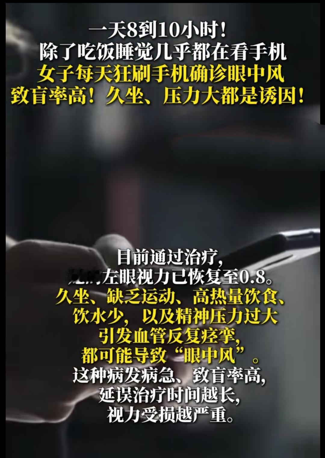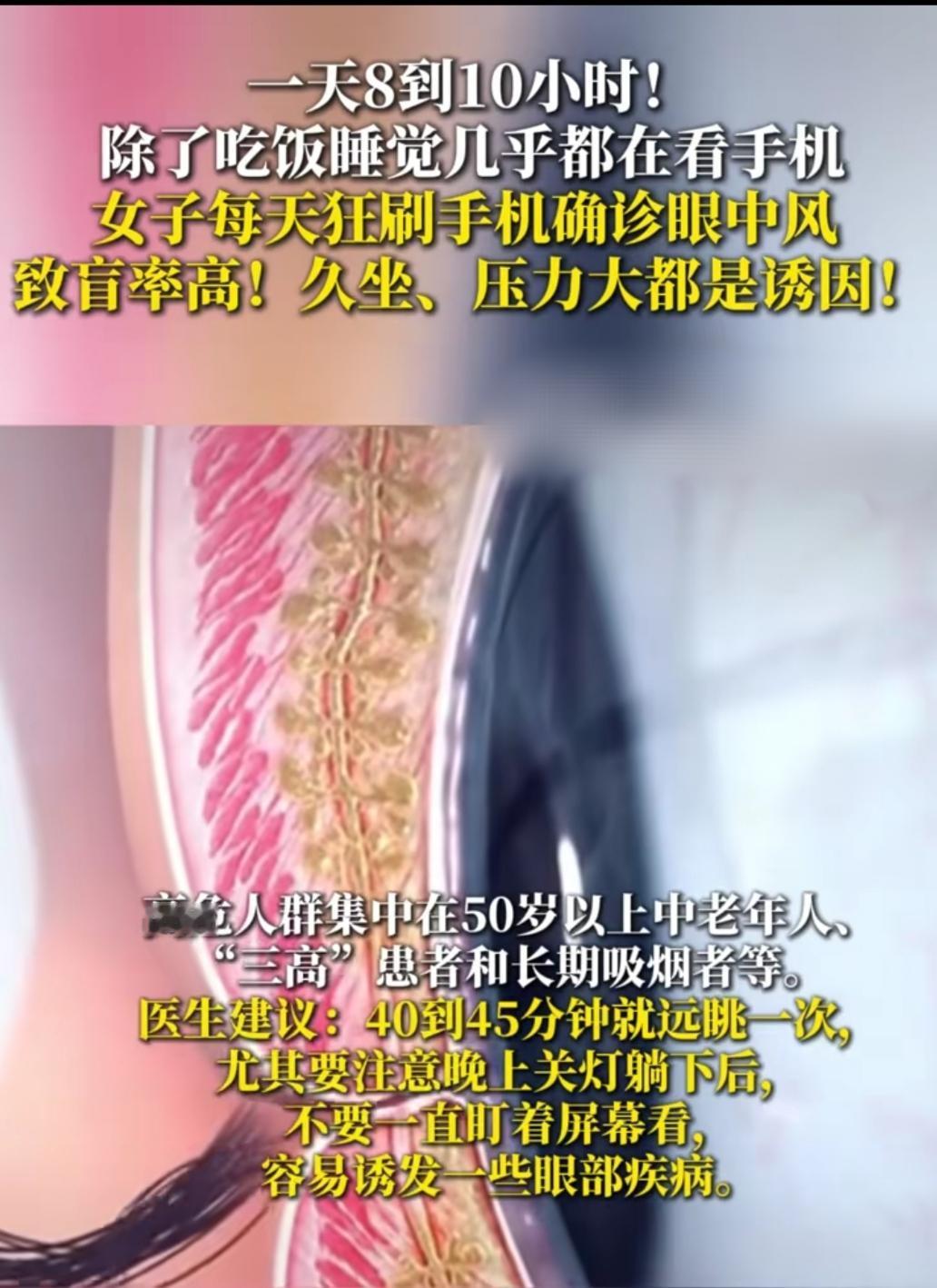 刷手机成了日常标配?江苏常州的杨女士把这事儿做到了极致,工作生活里一天攥着手机8到10小时,除了吃饭睡觉,屏幕就没离开过视线。本以为只是眼睛酸涩的小毛病,直到某天左眼突然视物模糊、有黑影遮挡,她才慌慌张张跑向医院。 医生给出的诊断让她吓出一身冷汗:视网膜分支动脉阻塞,也就是俗称的“眼中风”。原来杨女士本身有高血压,却从没规律吃药,再加上长期盯着手机造成的眼疲劳,双重打击下触发了这种急性致盲眼病。万幸治疗及时,她的左眼视力恢复到了0.8,要是再晚一步,可能就永久失明了。 这事儿可不是个例,现在“眼中风”正悄悄盯上爱刷手机的人,尤其是“三高”人群和熬夜党。关灯躺刷、长时间盯着屏幕,都是在给眼睛埋雷。别等眼睛亮红灯才重视,每看40分钟屏幕就远眺一会儿,基础病按时服药,别让一时的手机依赖,毁掉一辈子的好视力。