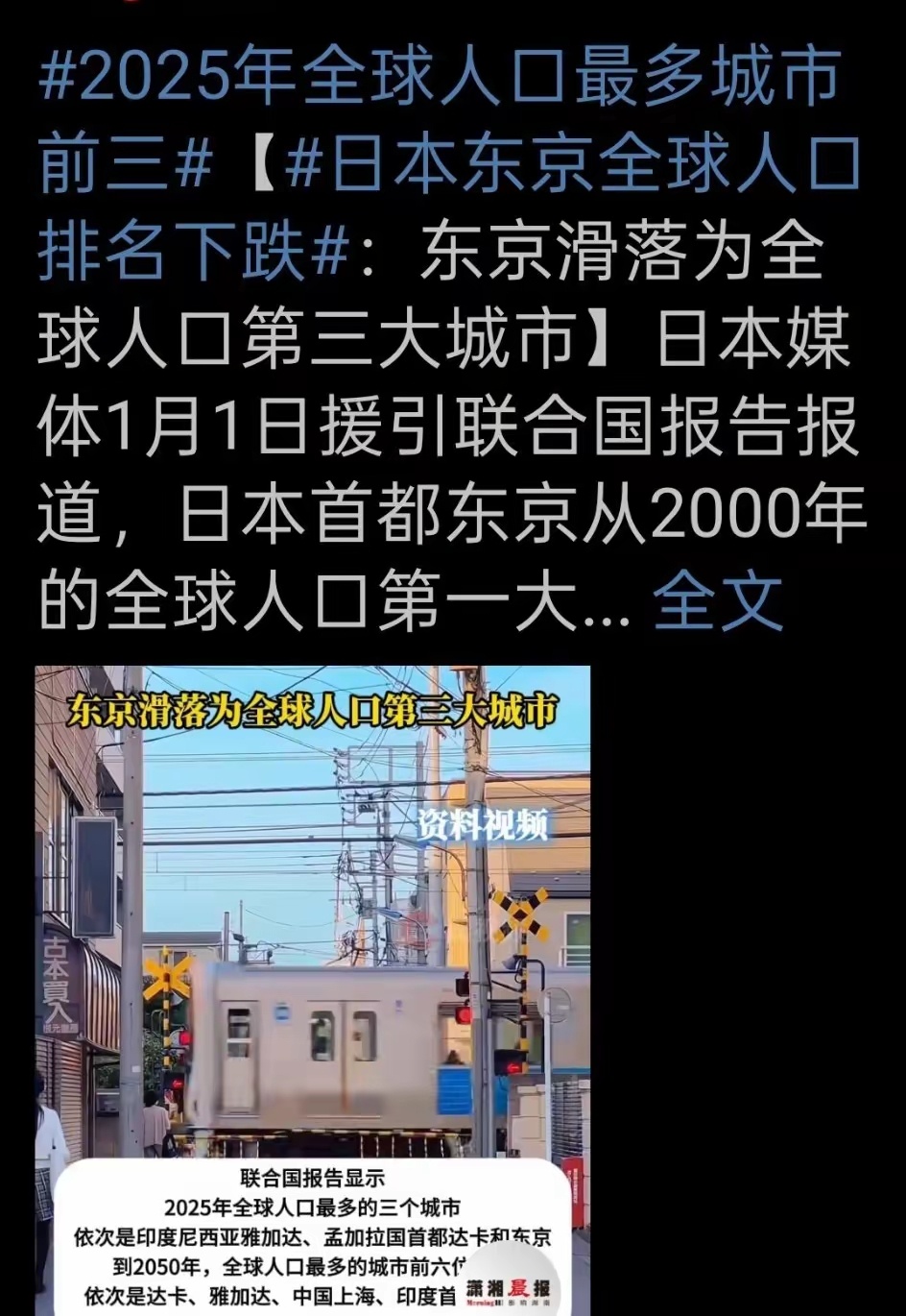 东京从2000年的全球人口第一大城市,降变为2025年的全球人口第三大城市。核心原因还是日本躲不开的老龄化和少子化“双重暴击”。联合国报告显示,东京从2000年全球人口第一城滑落为2025年第三,2050年或将跌至第七。2025年全球人口前三城为雅加达、达卡、东京,东京人口预计从3340万减至3070万。