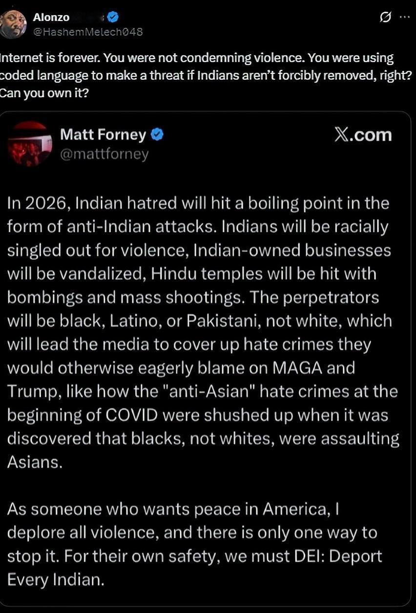 “印度人将遭到区别对待和攻击”,美国记者称2026年印度人容易受到大规模枪击,应将所有印度人驱逐出境以“拯救”他们。   说这话的美国记者叫马特·福尼,这人可不是第一次发表针对印度人的极端言论了,算是个出了名的反印激进分子。 他这次是在社交平台X上发的帖子,不光说2026年针对印度人的仇恨会变成实实在在的袭击,还具体说印度人、印度人的房子、生意还有印度教寺庙,都会更容易遭到大规模枪击、爆炸这种暴力攻击。 更离谱的是,他还扯着“希望美国和平”的幌子,说自己反对一切暴力,所以唯一的解决办法就是把所有印度人都驱逐出境,还编了个口号叫“DEI:驱逐每一个印度人”。不过这帖子发出来后引发了轩然大波,骂声一片,最后他自己又把帖子删了,还倒打一耙说自己收到了死亡威胁。 可能有人会问,这马特·福尼到底是个什么来头?怎么敢这么明目张胆地煽动仇恨?其实他之前就因为发表反印言论丢过工作,之前在一家叫“The Blaze”的美国新闻机构上班,专门负责报道H-1B签证相关的事和印度相关议题,结果就因为老是发表针对印度人的不当言论被开除了。 除了这次的极端言论,他之前还攻击过一位刚被任命为电商平台CEO的印度裔美国人,说人家“不合格”,还造谣说人家上任后第一件事就是开除所有美国人,换成其他印度人。从这些事儿就能看出来,这人就是靠着发表反印仇恨言论博眼球,早就没了记者该有的客观和底线。 大家可别觉得这只是马特·福尼一个人的胡言乱语,他这话能引起这么大关注,关键是戳中了现在美国社会的一个痛点——反印度情绪确实在不断升温,而且已经不是藏在暗处的小打小闹,早就摆到明面上了。 最直观的就是社交媒体上,针对印度人的种族主义言论和排外言论越来越多,除了网络上的口诛笔伐,现实中的冲突也越来越多。 就说前不久,美国得克萨斯州有一座印度教寺庙举行祝圣仪式,本来是件喜庆事,寺庙里的人还特意奏响了美国国歌和印度国歌,想体现自己既融入美国又保留传统的心意,结果寺庙围墙外来了几十名保守派基督徒抗议,骂他们崇拜的印度教神祇是“恶魔之神”。 更让人寒心的是,当地的右翼政客还借着这事儿煽风点火,有个参议院候选人直接在社交媒体上发文质问:“我们为什么允许一尊虚假的印度教假神雕像出现在得克萨斯?我们是个基督教国家。” 那为啥美国的反印度情绪会突然变得这么强烈呢?这背后其实和美国的移民政策还有政治环境分不开。这些年,美国的移民问题一直是个大争议,尤其是特朗普竞选总统以来,强硬的移民政策成了不少右翼势力的卖点,而印度裔美国人因为一个叫H-1B的签证政策,成了被攻击的重点目标。 这个H-1B签证是给高技能移民的,很多印度的科技工作者都是靠这个签证去美国工作的,而且占比还不低。 不少美国右翼政客就借着这个事儿做文章,说印度人靠这个签证“作弊”,抢了美国人的工作,损害了美国工人的利益。 这种反印情绪已经开始产生实实在在的影响了。最明显的就是去美国的印度学生数量大幅下降,去年印度学生还是赴美外国留学生里最多的,结果今年一下子就少了很多。 现在再回头看马特·福尼说的那些话,虽然极端又荒谬,但也从侧面反映出美国反印情绪的严重性。他的言论之所以能引发这么大争议,就是因为大家都担心这种仇恨言论会进一步助长暴力行为,真的让2026年变成针对印度人的“灾难年”。 毕竟现在已经有不少极端声音因为美印关系的波动变得越来越嚣张,之前特朗普政府就因为和印度在贸易、石油购买等问题上有分歧,对印度加征了高额关税,还取消了访问计划,美印关系变冷也让一些极端分子觉得攻击印度人“有道理”。 说到底,马特·福尼的极端言论就是美国当下撕裂的社会环境和愈演愈烈的排外情绪的产物。不管是哪个国家的人,只要是合法移民、努力生活、为当地社会做贡献,就不该被区别对待,更不该被无端攻击和驱逐。 而美国社会如果任由这种仇恨情绪蔓延,最终伤害的只会是自己。毕竟这些年印度裔美国人给美国的科技、经济、文化发展都做出了不少贡献,要是真把这些人都逼走了,对美国来说也是个不小的损失。 现在大家最担心的就是,随着2026年越来越近,这种反印情绪会不会真的像马特·福尼预测的那样,升级成更多的暴力袭击,希望美国能有人站出来制止这种仇恨煽动,不然受伤的只会是更多无辜的人。 权威信源: 2026年,印度的仇恨情绪将以反印度袭击的形式达到顶峰。--马特·福尼