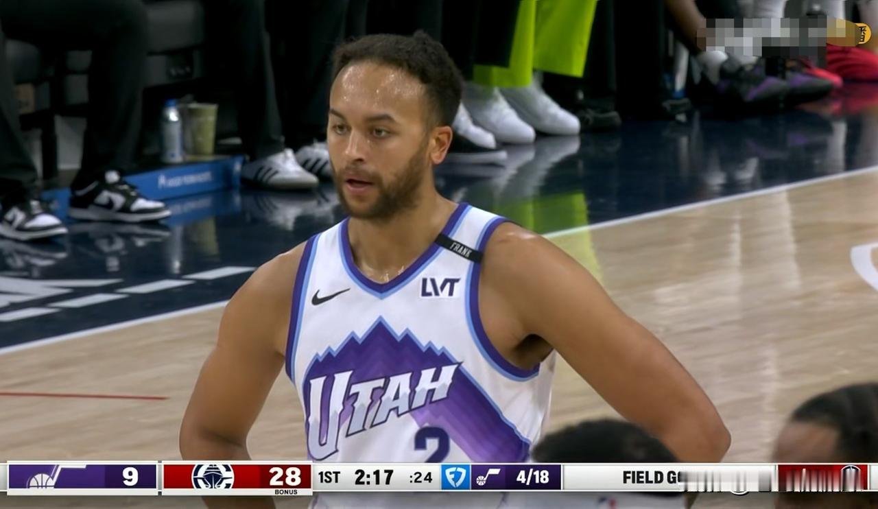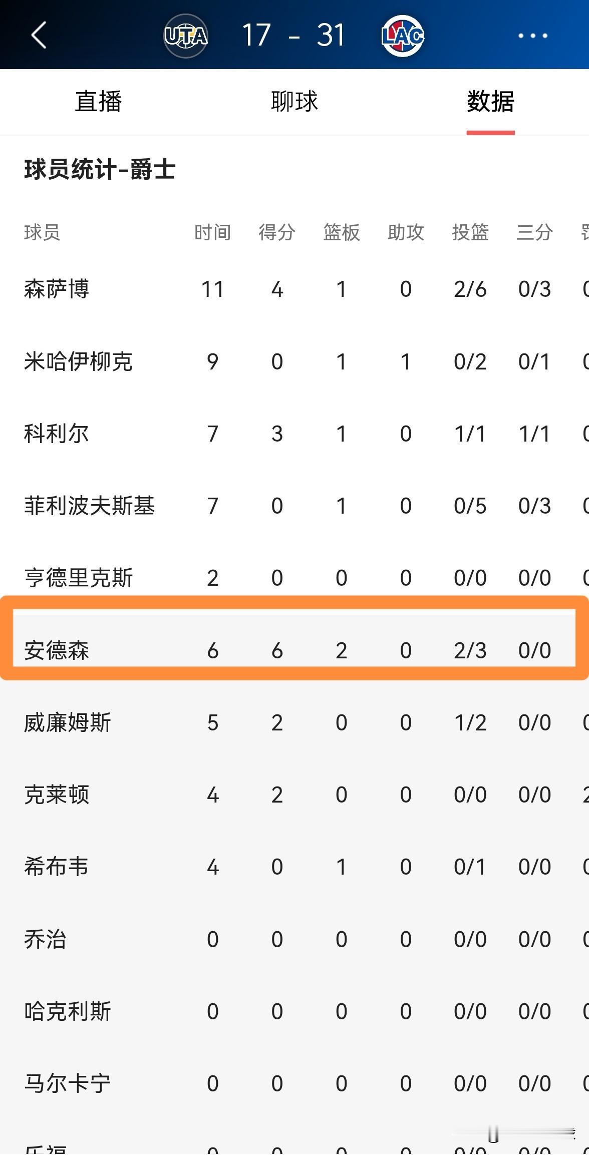 爵士老将李凯尔真是不负众望!在今天爵士客场挑战快船的比赛中,目前双方的首节比赛已经结束,虽然爵士以17:31落后于对手,但是李凯尔在球队缺兵少将的情况下替补出战6分钟,投篮3中2,其中罚球3中2非常高效的得到6分,还有2篮板1抢断1盖帽,他的场上正负值为全队最高的+2。 老实说,如果不是爵士伤兵满营的话,李凯尔很难获得出场机会,不过他在第一节比赛中的表现确实没有辜负球队的期望。