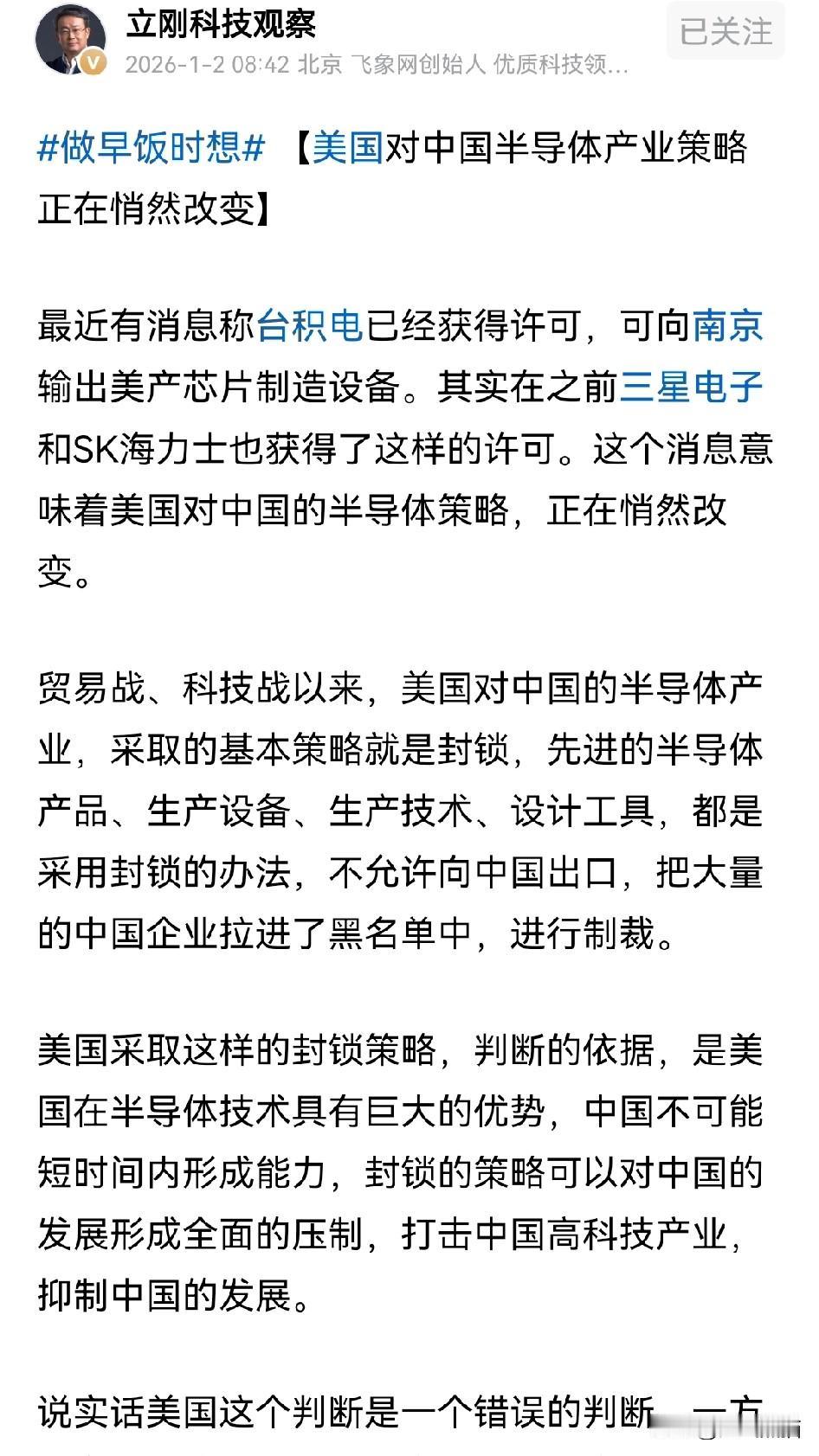 美国幡然悔悟了, 之所以对中国半导体产业的转变,从之前的封锁变成现在的倾销,应该是受到了公知的忽悠,或者是说搜集的情报不准确。 本来认为对于中国芯片产业进行全面的封锁,不管是高端的还是低端的,不管是技术,设备,还是产品,通通的一封了之,以为这样就可以阻止中国芯片产业的进程。 但忽略了中国有最完备的产业链,庞大的市场,以及数量众多的高科技人才,中国芯片产业发展最好的时期就是美国封锁最严重的时期,这才让美国逐渐悔悟。 现在美国放开成熟制程芯片,并加大台积电在国内的扩产,就是想用倾销来打压国内的企业,如今这一点被戳破,这条路肯定也走不通。