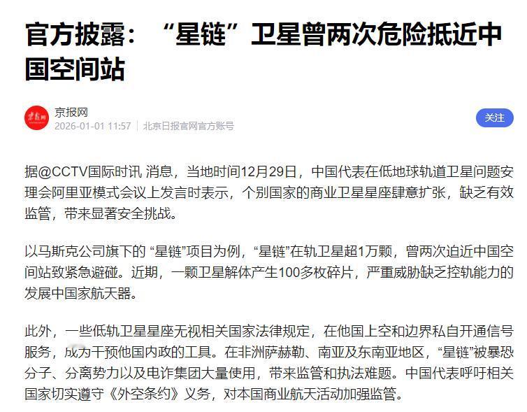 星链,有再一再二,没有再三再四。 星链的卫星,已经两次危险靠近我们的天宫空间站,如果还有下次,一定要将其捕获,或者击毁。 击毁不行,会有碎片,最好是捕获。 根据中国科学院软件研究所的跟踪数据,截至2025年6月,SpaceX已累计发射星链卫星8875颗,其中在轨4577颗,2024年一年就发射了超过1900颗,平均4.1天就有一批卫星上天。 国际电信联盟(ITU)早就测算过,近地轨道最多只能容纳约6万颗卫星,而目前各国申请总量已超7万颗,星链一家就占了大头,硬生生把公共太空挤成了“单向车道”。 这种抢占资源的操作,和当年日本在冲之鸟礁搞吹填的逻辑如出一辙,都是想通过“先到先得”的规则,把不属于自己的公共资源变成私产。 回顾过往,我们在联合国的抗议从来都不是空喊口号,而是先礼后兵的预警,当年日本无视国际法,在冲之鸟礁非法吹填,试图将礁石变成“岛屿”抢占海洋权益,我们在联合国多次提出严正抗议,可日本不听,美国更是装聋作哑。 既然讲道理没用,我们便用实力说话,从2013年开始,中国在南海开启吹填造岛工程,用自主研发的“天鲸号”挖泥船,以每小时4500立方米的挖泥效率,将永暑礁吹填成2.8平方公里的永暑岛,美济礁变成5.66平方公里的美济岛,渚碧礁拓展至4平方公里,形成相互呼应的岛礁基地群。 这些岛屿不仅改善了驻守人员的工作生活条件,更让我们在南海的主权权益有了坚实依托,用实际行动告诉世界,抗议无效时,实力才是最好的话语权。 再看美国将机器人用于军事化的例子,当年美国国防高级研究计划局(DARPA)秘密研发“小虾”微型机器人,能通过排水管渗透,还搞所谓“微型机器人奥运会”测试作战能力,我们在联合国提出抗议,指出这种行为会加剧军备竞赛,可美国置若罔闻。 于是我们转头深耕无人作战装备,从“机器狼”地面作战机器人,到翼龙、彩虹系列察打一体无人机,再到可协同作战的无人艇,形成了完整的无人作战体系。 而俄乌冲突中,星链卫星为乌军提供通信支持,让其能远程控制无人机和无人艇作战,这更印证了我们当初的担忧并非多余,也证明了我们发展同类技术的必要性——你把技术当武器,我就只能把自己的盾牌铸得更厚。 放到星链这件事上,逻辑其实一脉相承,如果SpaceX继续无视我们的抗议,无视航天员的生命安全,继续疯狂挤占轨道资源,等待它的绝不会是无动于衷。 首先,我们的低轨卫星星座会加速组网,中国星网的GW星座规划发射1.3万颗卫星,上海垣信的千帆星座预计2030年底部署超1.5万颗,蓝箭航天的鸿鹄星座也申请了1万颗,截至2025年,我们向ITU申请的卫星总数已达5.13万颗。 2025年7月底以来,中国星网的发射间隔从一两个月缩短到3-5天,千帆星座更是以“一箭18星”的频率密集发射,这种组网速度,就是要在星链霸占更多轨道前,为自己的太空活动争取足够空间。 其次,我们的太空防御和碎片处理技术早已不是纸上谈兵。 2025年12月,神舟二十一号乘组航天员出舱8小时,成功安装了空间碎片防护装置,这套采用复合装甲材料的“硬核盾牌”,能抵御小尺寸碎片撞击。 更重要的是,我们早就验证了碎片捕获技术,“遨龙一号”曾模拟抓取太空碎片并带入大气层烧毁,天舟七号货运飞船也搭载过碎片清理试验装置完成测试,计划2030年前发射专门的太空垃圾清理卫星。 星链卫星单颗成本仅50万美元,机动能力薄弱,一旦再次危险靠近,我们那些经过实战化测试的捕获装置,完全有能力将其“请”出危险轨道,既不会像击毁那样产生大量碎片,又能有效消除威胁,这可比单纯抗议实在多了。 近地轨道是全人类的公共资源,不是SpaceX的私产,ITU的“先到先得”规则背后,更应该是“负责任使用”的底线。 我们的抗议,既是为了天宫空间站和航天员的安全,也是为了维护太空环境的可持续性。 但如果星链非要把我们的克制当成软弱,非要挑战“有再一再二,没有再三再四”的底线,那也只能怪它不懂国际社会的生存法则——在太空领域,讲道理的前提是双方都愿意遵守规则,要是一方执意蛮干,另一方自然会用更硬核的方式捍卫自己的权益。 就像当年南海吹填让我们掌握了区域主动权,无人装备发展让我们不再受制于人,星链的步步紧逼,只会倒逼我们在低轨卫星组网、太空防御、碎片清理等领域加速突破。 等我们的卫星星座全面建成,太空监测和捕获技术愈发成熟,星链再想靠“数量优势”抢占轨道、制造威胁,恐怕就没那么容易了。 毕竟太空不是谁的后花园,想在这里横着走,得先看看有没有人答应,有没有实力支撑,而我们向来的原则是,人不犯我我不犯人,人若犯我,我们有的是办法让其明白什么叫“负责任的外空行为”。