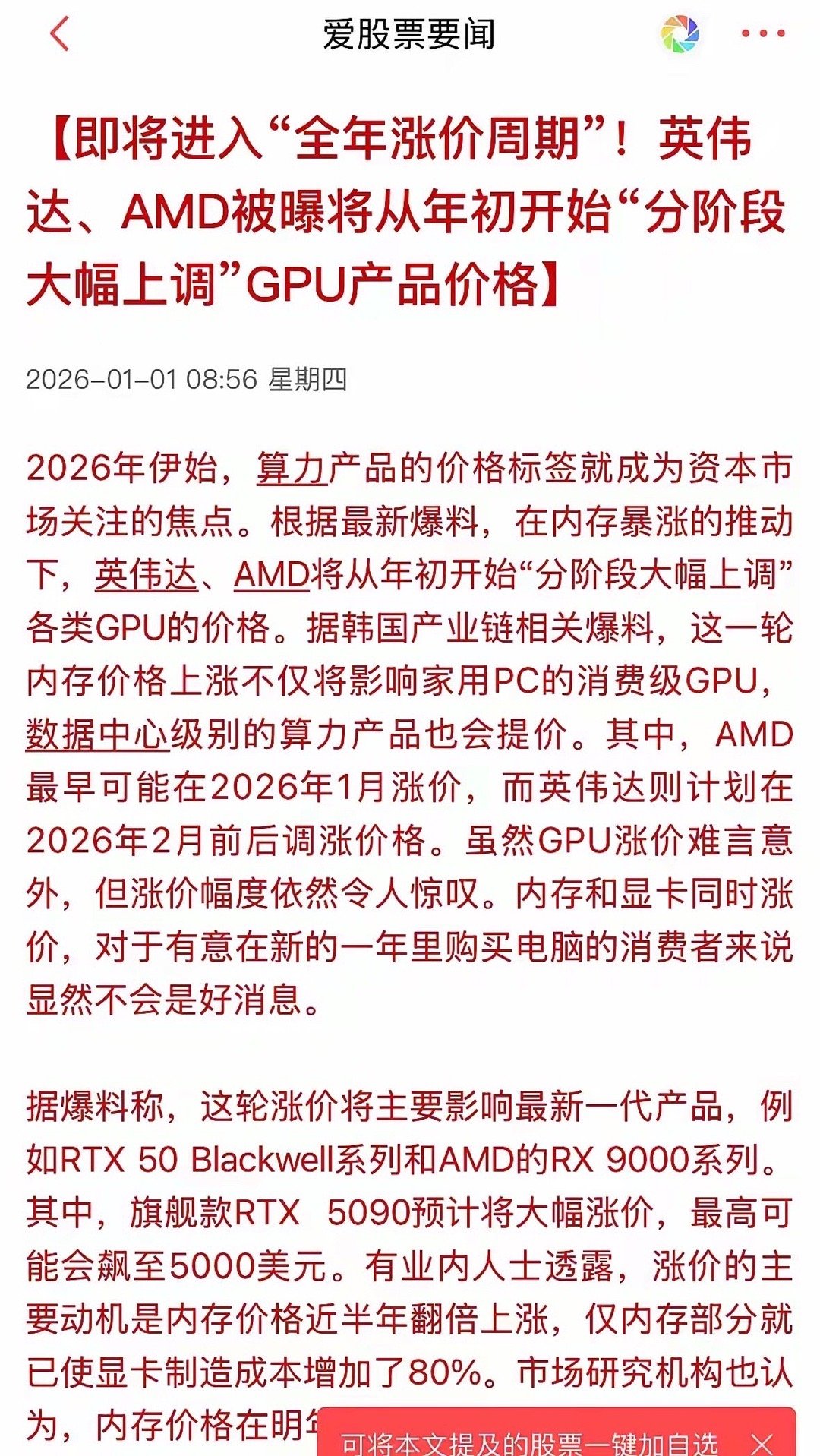 2026第一则股市利好方向,GPU进入全面涨价年份,节后会继续大涨吗?新年第一天,英伟达、AMD宣布从今年年初开始“分阶段大幅上调”各类GPU价格,大家注意措辞是贯穿2026全面、分阶段、大幅涨价!这对于GPU是第一个利好第二个就是GPU公司提速IPO,之前有摩尔线程、沐曦股份,今天又宣布GPU四小龙之一的遂原股份也已经完成辅导,也就意味着上半年也会到来,结合第一个对于GPU方向是长期利好众所周知GPU方向2025年迎来了超级爆发周期尤其是核心硬件端的CPO和PCB完全走出超级行情,那么接下来对于这两个方向依然是持续的利好,核心的公司业绩也是超预期的增长,主要原因就是市场对于GPI需求的超预期增长所以在新的一年这个方向依然是趋势逻辑的方向没有改变,大家要摒弃思维,做趋势的朋友