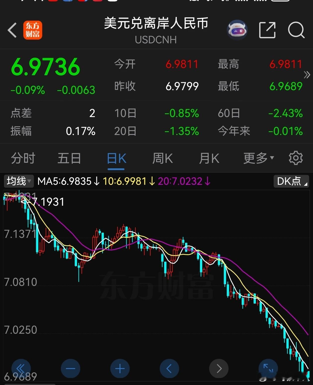 人民币汇率今天离岸人民币兑美元升破6.97,最高升至6.9678,创了2023年5月以来新高。原因可能是美元贬值加上企业集中结汇,对留学的,出国玩儿的,买进口商品来说成本下降了。
