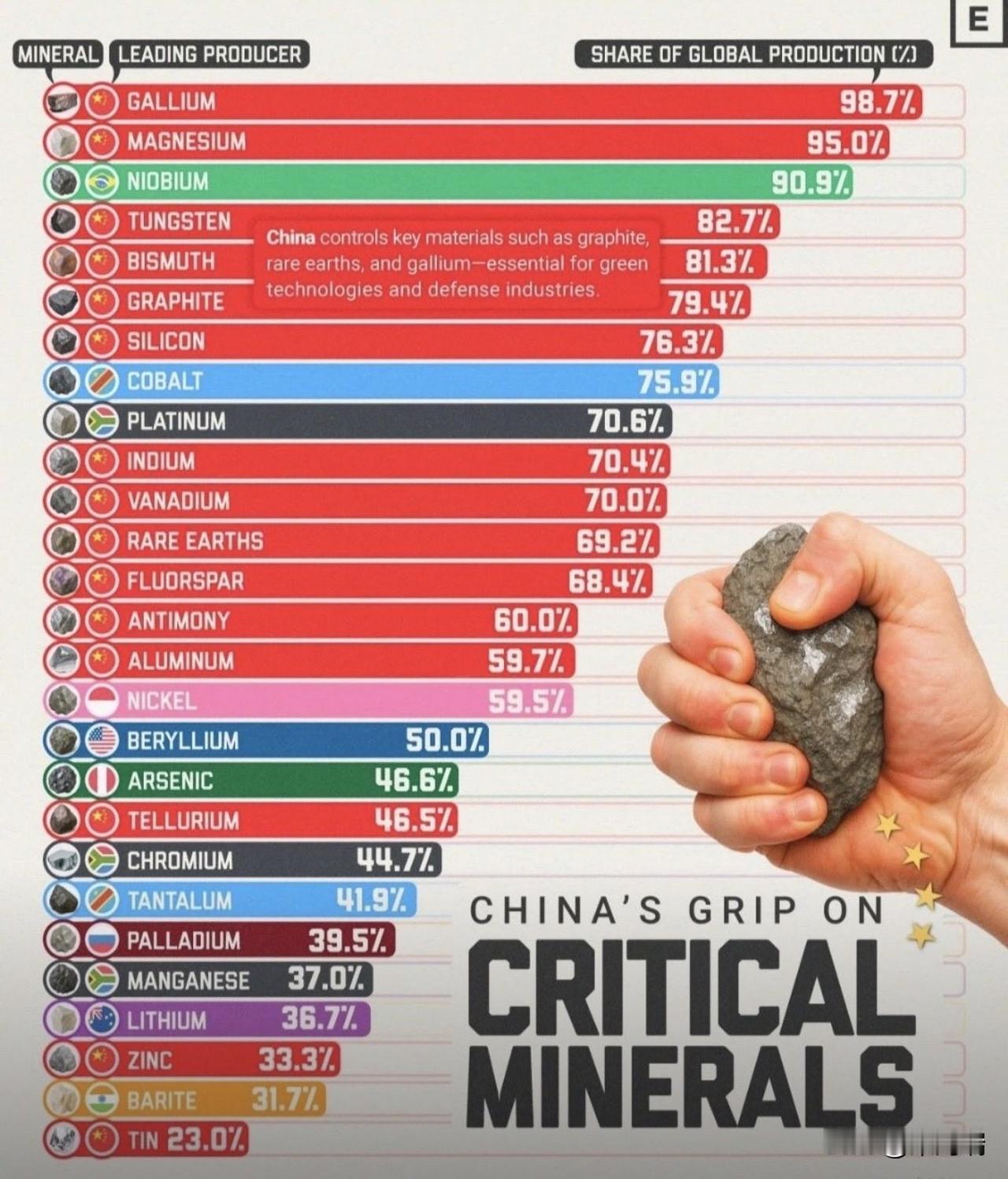 中国在全球关键矿产生产中占主导地位,这些矿产对绿色技术和国防工业至关重要。 中国对关键矿产的控制 镓: 全球产量份额为 98.7% 镁: 全球产量份额为 95.0% 铌: 主要生产国为巴西,但中国在许多矿产的精炼加工环节占主导 钨: 全球产量份额为 82.7% 铋: 全球产量份额为 81.3% 石墨: 全球产量份额为 79.4% 硅: 全球产量份额为 76.3% 钴: 全球产量份额为 75.9% 铂: 全球产量份额为 70.6% 铟: 全球产量份额为 70.4% 钒: 全球产量份额为 70.0% 稀土: 全球产量份额为 69.2% 萤石: 全球产量份额为 68.4% 锑: 全球产量份额为 60.0% 这些矿产是电动汽车、电池、半导体、可再生能源和先进国防技术的基础材料。 国际能源署 (IEA) 的报告显示,中国在能源转型关键矿产领域的控制力没有减弱,反而有所加强,特别是在加工和精炼环节。 这种高度集中的供应链使全球容易受到出口限制或政治紧张局势的影响。
