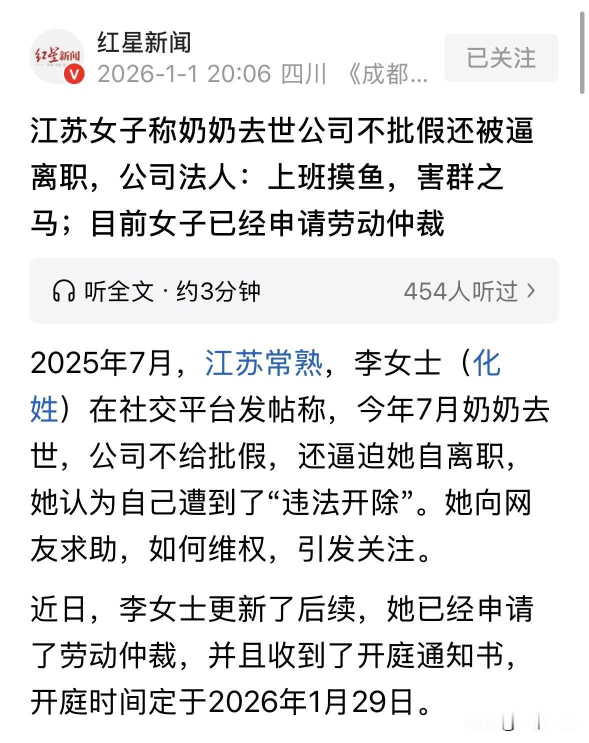 江苏常熟,女子曾拒绝老板让她从文员转销售的提议,没想到把老板得罪了,这天,女子接到奶奶离世的消息,她连忙请假,想赶回去送老人最后一程,谁料,她人都上高铁了,人事突然改口,说老板不同意她请假,让女子二选一,要么自己走,要么被开除。为了赶她走,老板还捏造她上班摸鱼,更是大言不惭表示:谁家爷爷奶奶不过世?都是虚头巴脑的借口! 李女士奶奶去世,本是人生至痛,她却在奔丧的高铁上,被公司逼到了墙角。 公司给她两个选择:要么自己主动走人,要么等着被开除。 事情发生在2025年7月。李女士在常熟一家公司做文员。这工作她干了1年多,向来勤勤恳恳。 那天家里传来消息,说奶奶走了。李女士悲痛万分,赶紧找经理请假,要回去送奶奶最后一程。 经理和人事都点头了,给了5天事假。李女士心想,领导都同意了,那肯定没问题了,她赶紧买了高铁票往家赶。 可还没在高铁上坐热,她手机就弹出一条消息,是人事发来的。 对方突然说,总公司法人不批假,如果你想回家奔丧,只能离职。 李女士不知道公司为什么突然改口了,她慌忙中赶紧回复:那我不请假了,回来上班行不行? 人事却一口回绝,说不行,回来要么走人,要么被开除,没别的路。 这一刻,李女士彻底崩了。她一边哭一边给人事打语音电话,几乎是哀求,说我丧事办完也就几天,咱们能不能事后再商量?这几天工资你们也不在乎,何必非要在这种时候逼我做决定? 但电话那头,人事像个没有感情的复读机,死活不松口。 后来李女士才回过味来,这哪是针对请假,分明是针对她这个人。 原来,她们苏州总公司的那个法人林老板,早就看她不顺眼了。 之前林老板来分公司视察,找她谈话,意思是想让她从文员转去做销售。 李女士觉得自己性格内向,干不来销售,就婉拒了。 这一拒绝,好像把老板得罪了。 这次人事逼她离职时,话里话外都暗戳戳点她,说你文员干得好好的,销售不愿意转,说明你不适合,正好趁你奔丧把这事了结了。 林老板后来面对记者,更是把话挑明了,直接骂李女士是“害群之马”,说她天天上班玩手机摸鱼。 李女士觉得冤枉透顶。这分公司连个监控都没有,既没Wi-Fi,也不打卡,对方说她摸鱼,完全就是凭空捏造! 李女士看得清楚,这无非就是想0成本赶她走的借口罢了。 在老家办完丧事,李女士越想越气。她没直接回公司吵架,而是找律师写了一份《被迫解除劳动关系通知书》。 接着,她用快递寄给了公司,要求结清工资,并按规定给辞退赔偿金。 结果呢?迟迟没人回应她。 直到2025年8月底,公司才把工资打过来,但赔偿金一分没有。 李女士去劳动部门投诉,工作人员一听这情况,说你直接走仲裁吧。 李女士这下想起,这1年多里,公司压根就没给她交社保。虽然入职时人事提过一嘴,但当时李女士不懂法,以为是行业潜规则,也就没硬要。 现在闹翻了,这成了公司手里的把柄。林老板说:入职时都谈好了,她现在反咬一口,就是背信弃义。 记者联系上这位林老板时,真被他的言论惊掉了下巴。 对于李女士请假奔丧,林老板不仅没有半点同情心,反而一脸不屑,说别跟我扯什么丧假前丧假后,谁规定奶奶去世就得给假?谁家爷爷奶奶不过世?这都是虚头巴脑的借口! 在他嘴里,李女士就是个“天天摸鱼”的员工,他作为民营企业老板,必须对现有员工负责,所以坚决要开除她。 哪怕李女士已经申请了仲裁,林老板还是理直气壮,说我做生意清清白白,不欠她一分钱工资。既然她要仲裁,那就仲裁庭上见! 李女士现在已经不指望和老板讲人情了。她铁了心要把仲裁走到底,不光是为了赔偿金,更是为了争这口气。 最近她收到了好消息,劳动仲裁委已经立案,开庭通知书也下来了,定在2026年1月29日。 那么,从法律角度来看,公司的行为合理合法吗? 首先,公司的解除理由不成立。 法人林先生坚称李女士“上班摸鱼”、“是害群之马”,并以此作为开除的理由。 根据《劳动合同法》第39条,劳动者严重违反用人单位规章制度的,用人单位可以解除劳动合同。但是,这需要用人单位提供确凿的证据。 然而,林先生的说法在法律上属于口头指控,缺乏证据链支持。 公司在没有证据的情况下,单纯凭老板个人喜好或主观臆断强行辞退,属于典型的“违反本法规定解除劳动合同”。 公司在李女士已获直属领导同意并已在高铁上的情况下,单方面反悔并以“不批假”为由要求其离职。 直系亲属去世,职工享受丧假是法定权利。直属领导的同意代表公司的职务行为,一旦生效,公司不能随意撤销。 依据《劳动合同法》第87条规定:用人单位违反本法规定解除或者终止劳动合同的,应当依照本法第四十七条规定的经济补偿标准的二倍向劳动者支付赔偿金。 赔偿金额应是经济补偿金(N)的2倍。 对此,你怎么看? 欢迎关注@一案一论