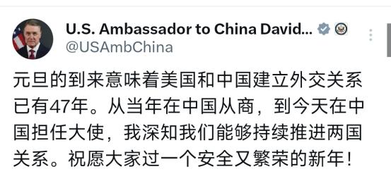 美国驻华大使庞德伟1月1日发文写道:“元旦的到来意味着美国和中国建立外交关系已有