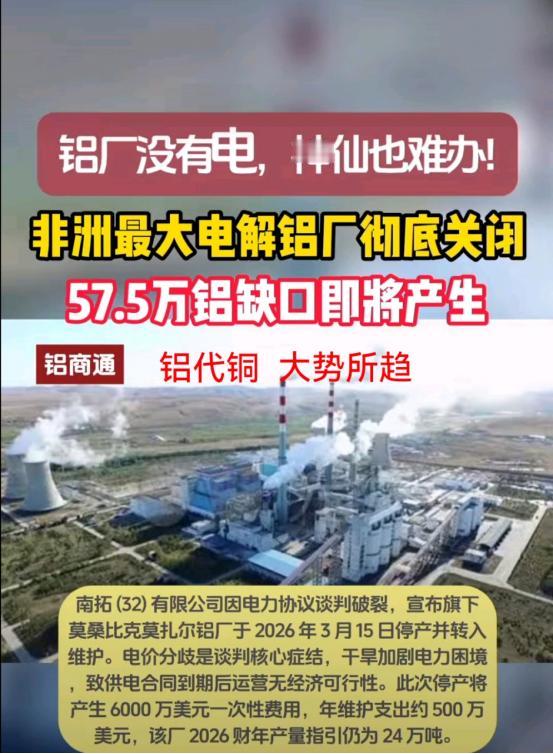 非洲最大的电解铝工厂——莫桑比克的Mozal铝厂,要在2026年3月15日前全面停产了。 听起来好像有点突然,但这事儿其实酝酿了很长时间。这座工厂的年产能高达58万吨,它的停产不是机器坏了,也不是工人罢工,而是因为一场谈了整整六年都没谈拢的电价谈判,彻底破裂了。 这座铝厂建在莫桑比克首都马普托,每年能生产58万吨电解铝,自从投产以来,就一直是非洲电解铝产业的核心。对莫桑比克来说,Mozal铝厂更是国民经济的“压舱石”。 早几年的时候,它出口的铝锭占全国出口总收入的一半还多,就算这几年占比降了些,依旧是该国最主要的创汇来源之一。工厂直接雇了几千名当地人,还带动上下游产业链,创造了好几万个就业岗位。 莫桑比克是联合国认定的最不发达国家,这样规模的产业,足以影响全国的就业稳定和经济走势。从全球范围来看,Mozal铝厂58万吨的产能,在全球每年7200万吨的电解铝产量里,占比还不到1%。 但因为它处在南部非洲的关键位置,长期给欧洲、非洲本地的汽车、光伏、电网等行业提供重要原材料,在全球铝供应链里,是少不得的一环。 电解铝产业天生就是“用电大户”,每生产一吨电解铝,大概要消耗1.4万度电。电力成本占比更是高达40%到50%,对电价的敏感度比普通行业高多了。 Mozal铝厂能不能正常运营,全看和莫桑比克国家电力公司(EDM)的电价协议。这场僵持了六年的谈判,核心矛盾就是电价要不要涨、涨多少。一边是EDM急着要上调电价,另一边是Mozal铝厂坚决不愿意接受成本飙升,双方就这么耗着。 莫桑比克的电力供应本来就先天不足,全国能用上电的地区只占30%左右,农村地区更是不到20%。全国70%以上的电力都靠水电,其中卡布拉巴萨水电站承担着全国六成以上的水电产量。 但受气候变化影响,旱季降水变少,水电站的发电量变得不稳定。再加上电网基础设施老旧,覆盖范围又有限,国内电力短缺的问题越来越严重。 更关键的是,莫桑比克的电力一直是“出口优先”,卡布拉巴萨水电站发的电,大概70%都出口到了南非、津巴布韦等邻国。这就进一步加剧了国内电力供需的不平衡。 EDM多次提出要上调电价,一方面是为了填补电网建设和维护的资金缺口,另一方面也是为了平衡国内民生用电和工业用电的矛盾,让Mozal这种高耗能的铝厂,承担更合理的电力成本。 而对Mozal铝厂的投资方,比如南拓32这些跨国企业来说,低价电力是他们当初选择在莫桑比克建厂的核心优势。这几年全球铝价虽然处于高位,2025年伦敦金属交易所的铝价,比上一年上涨了大约7.2%,但电解铝行业想扩大产能,一直受能源成本的制约。 中国是全球最大的电解铝生产国,已经把总产能控制在4500万吨左右,相当于设了个“天花板”,不能再随便扩产了。海外其他地区想新增产能,也会受电力、环保等条件的限制。 在这种背景下,要是Mozal铝厂接受大幅上调电价,生产成本会直接飙升,利润空间会被压缩,甚至可能陷入亏损。所以工厂方一直坚持,要长期稳定的低价电力,和EDM的涨价主张互不让步,谈判就这么僵持了下来。 这六年里,双方曾多次坐下来谈判,中间也有过阶段性的进展,但始终没达成长期共识。原来的电价协议快要到期,2025年下半年的最后一轮谈判,本来是打破僵局的关键。 可EDM能接受的涨价底线,和Mozal铝厂能承受的成本上限,差距实在太大,最后谈判彻底谈崩了。之后,投资方南拓32就宣布,因为没能就新的电力供应条款达成一致,Mozal铝厂会在2026年3月15日前全面停产。 这个决定也得到了行业机构的认可,中信证券就表示,Mozal铝厂停产的概率极高,可能会成为影响全球铝行业的关键事件。 这次停产风波的影响,早就超出了莫桑比克的国界。对莫桑比克来说,失去Mozal这个核心创汇企业,出口收入会直接大幅减少,税收也会流失。工厂里几千名员工会面临失业,本来就脆弱的经济会再受重创。 而在全球铝市场,Mozal铝厂58万吨的产能空缺,很难快速填补。当前全球电解铝产能处于紧平衡状态,中国的产能已经接近上限,2025年新增的产能只有10万吨。 其他地区的扩产计划,也受能源、基建等条件限制,没法快速落地。再加上之前世纪铝业因为设备故障,减产了20万吨。多重供应端的问题叠加在一起,可能会进一步推高全球铝价。铝价上涨后,又会影响新能源汽车、光伏、电网建设等下游行业的生产成本。 现在距离Mozal铝厂停产只剩三个月左右,双方有没有可能重新启动谈判,还不好说。莫桑比克政府大概也陷入了两难:要是妥协降价,留住工厂,就会牺牲国内电力建设的资金来源;要是坚持涨价,保障民生用电,又要承受经济下滑和就业压力。