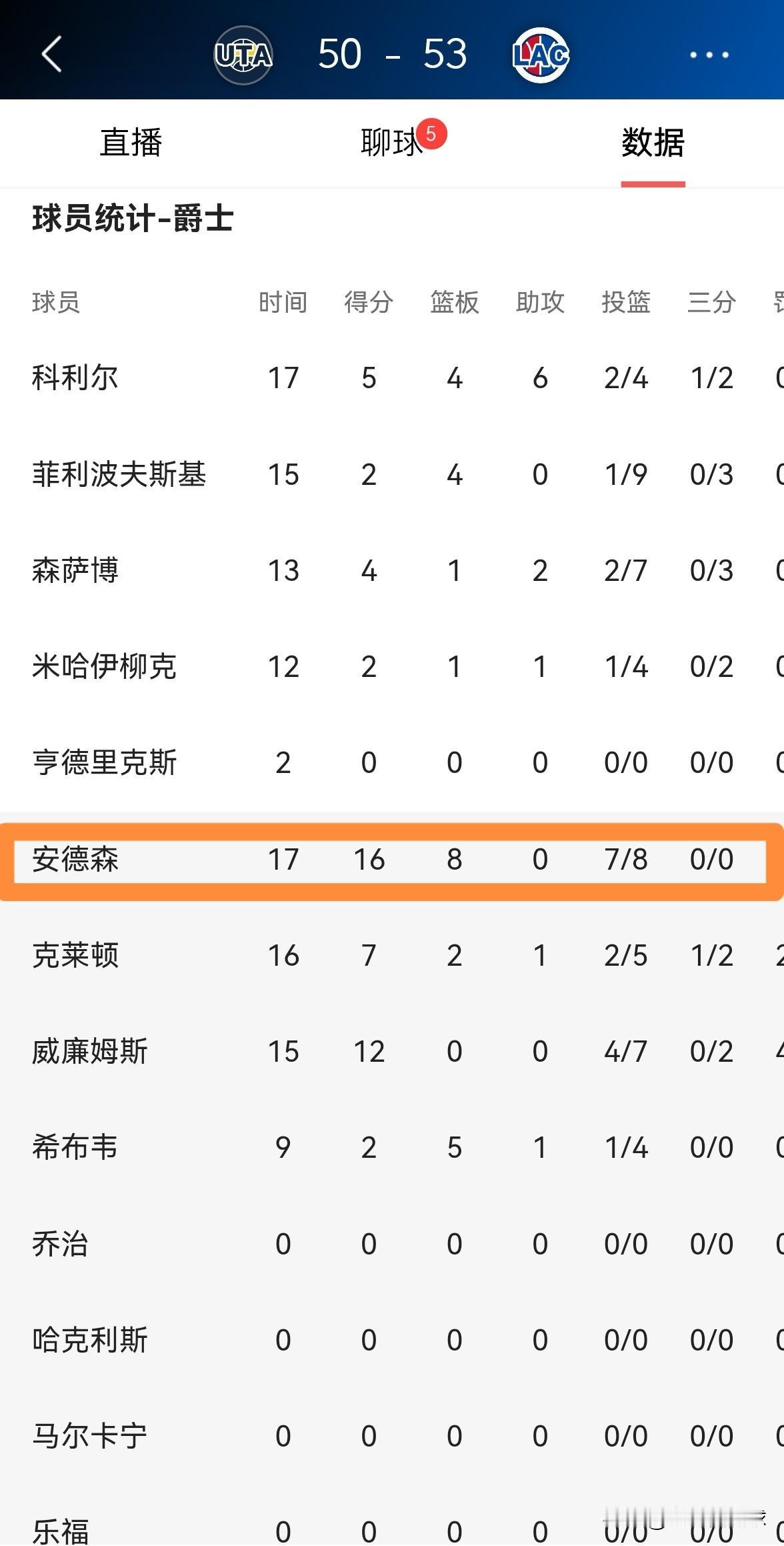 爵士大将安德森真是大发神威!在今天爵士客场挑战快船的上半场比赛中,安德森仿佛回到了自己的巅峰期,他在替补出战的17分钟里,投篮8中7,其中罚球3中2爆砍16分8篮板1抢断1盖帽,他的场上正负值为+18。 毫不夸张的说,如果不是安德森在上半场比赛中挺身而出,那么爵士在第二节比赛结束时绝对会大比分落后于快船。