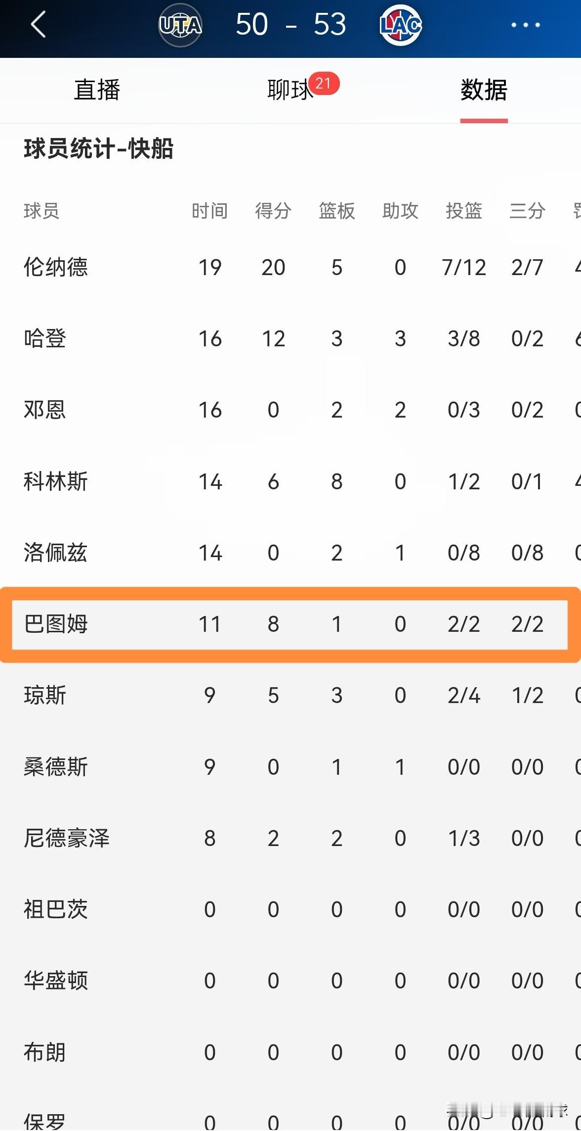 我一定要好好的夸夸快船老将巴图姆!在今天快船主场迎战爵士的上半场比赛中,巴图姆替补出战11分钟,三分球2中2,其中罚球2中2砍下8分,还有1篮板,没有出现任何的失误,帮助球队以53:50领先对手结束了前两节的比赛。 作为一名37岁的老将,巴图姆堪称快船阵中最值得信赖的替补,他不仅能攻善守,而且打球非常聪明。