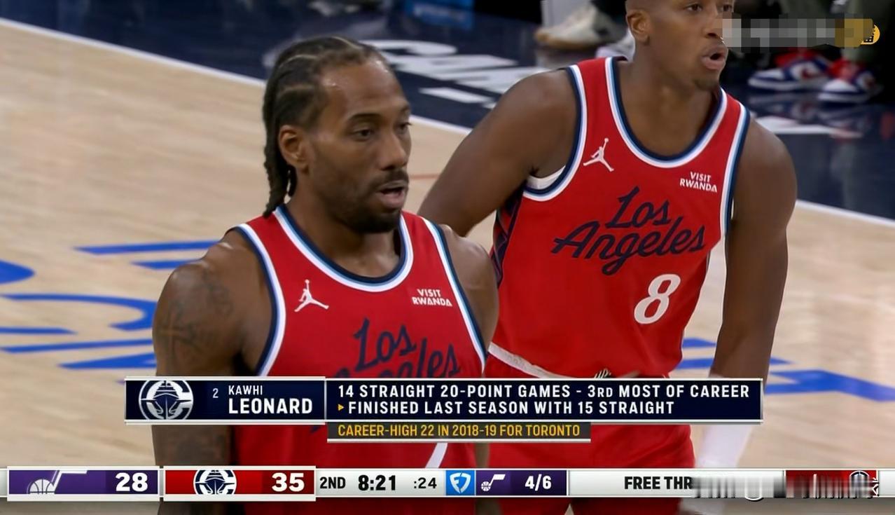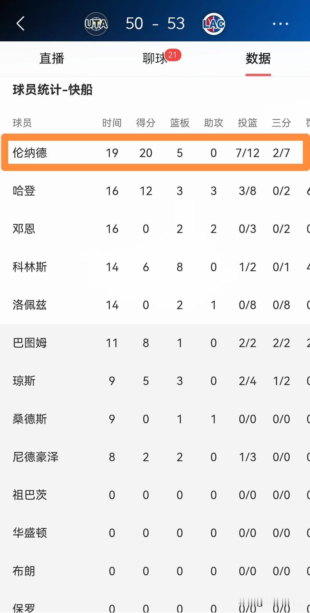 快船超级巨星伦纳德真是高效的离谱!在今天进行的快船和爵士的比赛中,目前双方的上半场比赛已经结束,快船暂时以53:50领先对手。在前两节比赛中,伦纳德延续了之前的火热状态,他在首发出战的19分钟里,投篮12中7,其中三分球7中2、罚球6中4轻松砍下20分5篮板1抢断2盖帽,他的场上正负值为+2。 不得不说,伦纳德真是一台稳定的可怕的机器,他已经连续多场比赛打出非常高效的比赛了。
