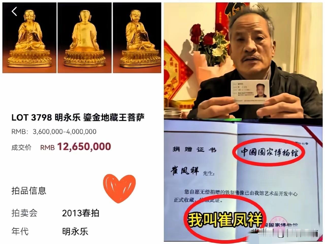 铲子别再往下挖了, 越挖这瓜越大, 庞叔令没等来南博还画,却 等来和庞家都有收藏爱好的“崔凤翔”,把家传的明代地藏鎏金佛刚捐给国博,再去展览的时候,却说“你就没捐过”!!! 崔凤祥是河北的普通老人,这尊明代地藏鎏金佛是他家传的宝贝,距今已有四百多年历史,是万历年间的珍品。佛像通高78厘米,重达19.5公斤,蓝底金花的底色雅致耐看,头手的鎏金历经数百年依旧光亮,底座是少见的喇叭状,在同期佛造像里算得上稀缺物件。老人打小就听祖辈说,这是老祖宗传下来的国宝,得好好护着,不能让它流落他乡。 2006年,年过五旬的崔凤祥做了个重要决定:把佛像无偿捐给国家博物馆。他心里想得特别简单,国家博物馆是最靠谱的地方,把宝贝交给国家,既能好好保护,还能让更多人看到它的艺术价值。为了送这尊佛,他用蛇皮袋小心翼翼裹好,背着39斤重的佛像,坐了一天一夜的绿皮火车赶到北京。 国博那边也挺重视,研究员侯松园带着五六名工作人员亲自接收,当场开箱查验、核对细节,之后郑重递上了盖着大红公章的正式捐赠证书。证书上明明白白写着佛像的名称、尺寸、重量和年代,在场的人还都在交接清单上签了字。崔凤祥连国博提议的捐赠仪式都婉拒了,啥好处都没要,揣着捐赠证书和一颗踏实的心回了家。 他怎么也没想到,这份掏心窝子的信任,会在三年后被击碎。2009年,崔凤祥实在惦记佛像,特意跑到国博想去看看,时任相关部门主任的陈永德查了半天,给出的答复让他当场愣住:“馆藏档案里没这东西,你自己联系当年的接收人吧。” 从那天起,70多岁的老人就踏上了漫漫寻佛路。近20年里,他往北京跑了17趟,坐的还是绿皮火车,亲笔写下七八十封信,打了几十通咨询电话,甚至录视频公开喊话。他的诉求特别简单,一分钱赔偿都不要,就想知道佛像还在不在,哪怕给张照片、说个存放的地方也行。 可每次得到的回应,不是“正在梳理”就是“请耐心等待”,连一份正经的书面答复都没拿到过。好在老人心思缜密,这些年和陈永德主任、侯松园沟通的电话录音都妥善保管着,还有国博捐赠后回赠的纪念瓷器,上面印着清晰的国博标志,所有能证明捐赠的凭证都没丢。 这事儿和南博的纠纷简直如出一辙。之前庞家后人捐给南博的137件古画,60年后少了5件,馆方一开始说“是伪作被调剂出去了”,结果其中一幅仇英的《江南春》现身拍卖行,估价高达8800万。现在国博又出现“捐赠文物查无此物”,让公众实在难以释怀。 《文物保护法》早就规定,国有博物馆接收捐赠必须建立藏品档案,30个工作日内就得告知捐赠人处理结果。国博自己的征集规则也明确要求“接收文物必须登记建档、全程留痕”,可如今佛像既不在馆藏系统,馆方又拿不出“是赝品”的书面鉴定,这种两头不沾的态度,既违反了规定,更寒了捐赠人的心。 民间捐赠本是支持文博事业的善举,普通人把家传宝贝无偿献出来,图的就是一个放心。要是盖着大红公章的捐赠证书最后都成了废纸,以后谁还敢把宝贝捐给国家?崔凤祥捐出去的不只是一尊佛像,更是对国家文博机构沉甸甸的信任。 这些文物是全民共享的文化遗产,不是哪一家机构的“私产”,更不该不明不白就没了踪影。要是管理上出了疏漏,就该一查到底、追责到人;要是被人违规处置了,更得给公众一个明明白白的交代。南博的画还没找回来,国博的佛像又没了下落,文博系统的信任重建,还有很长的路要走。 各位读者你们怎么看?欢迎在评论区讨论。