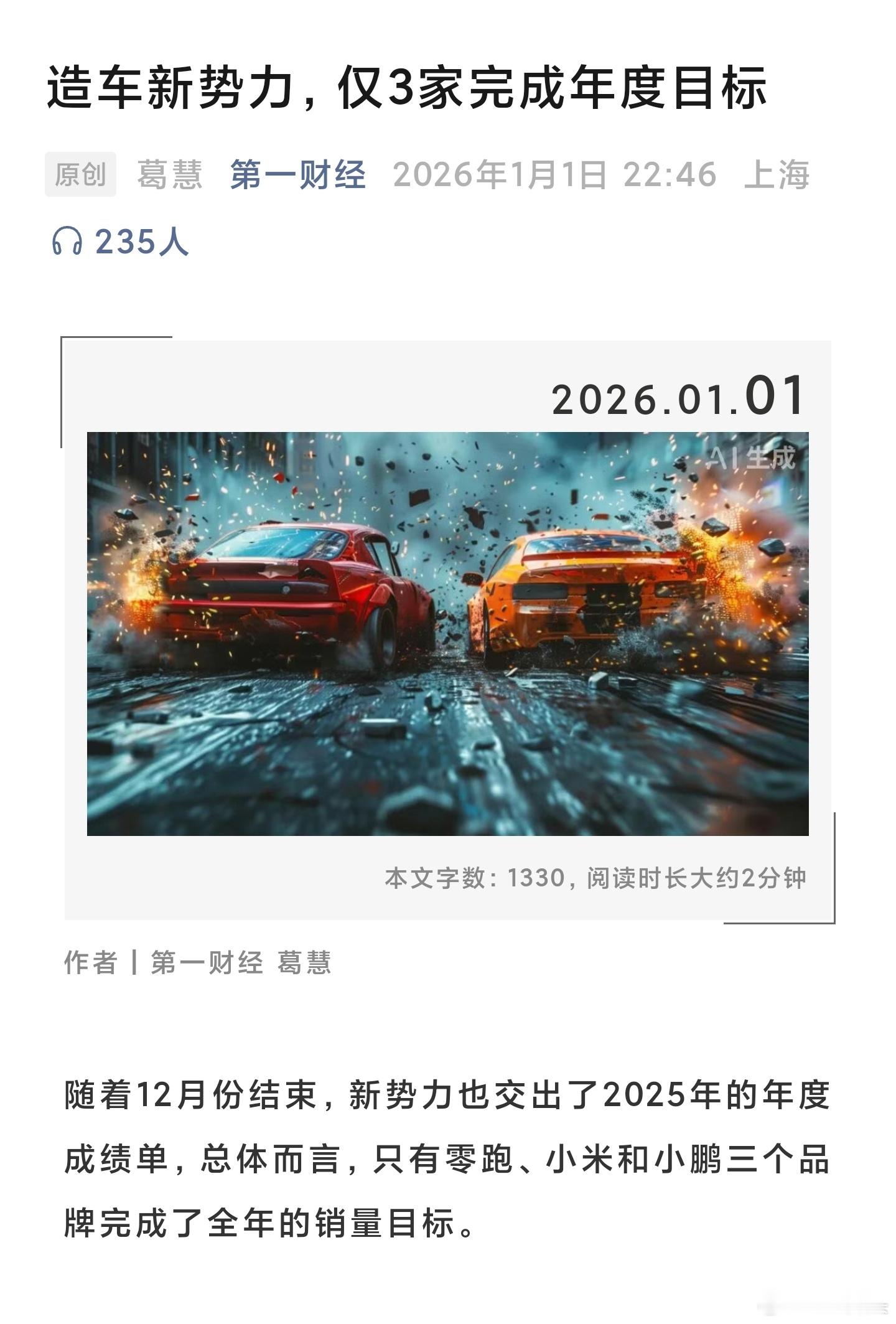 第一财经:只有零跑、小米和小鹏三个品牌完成了全年的销量目标。