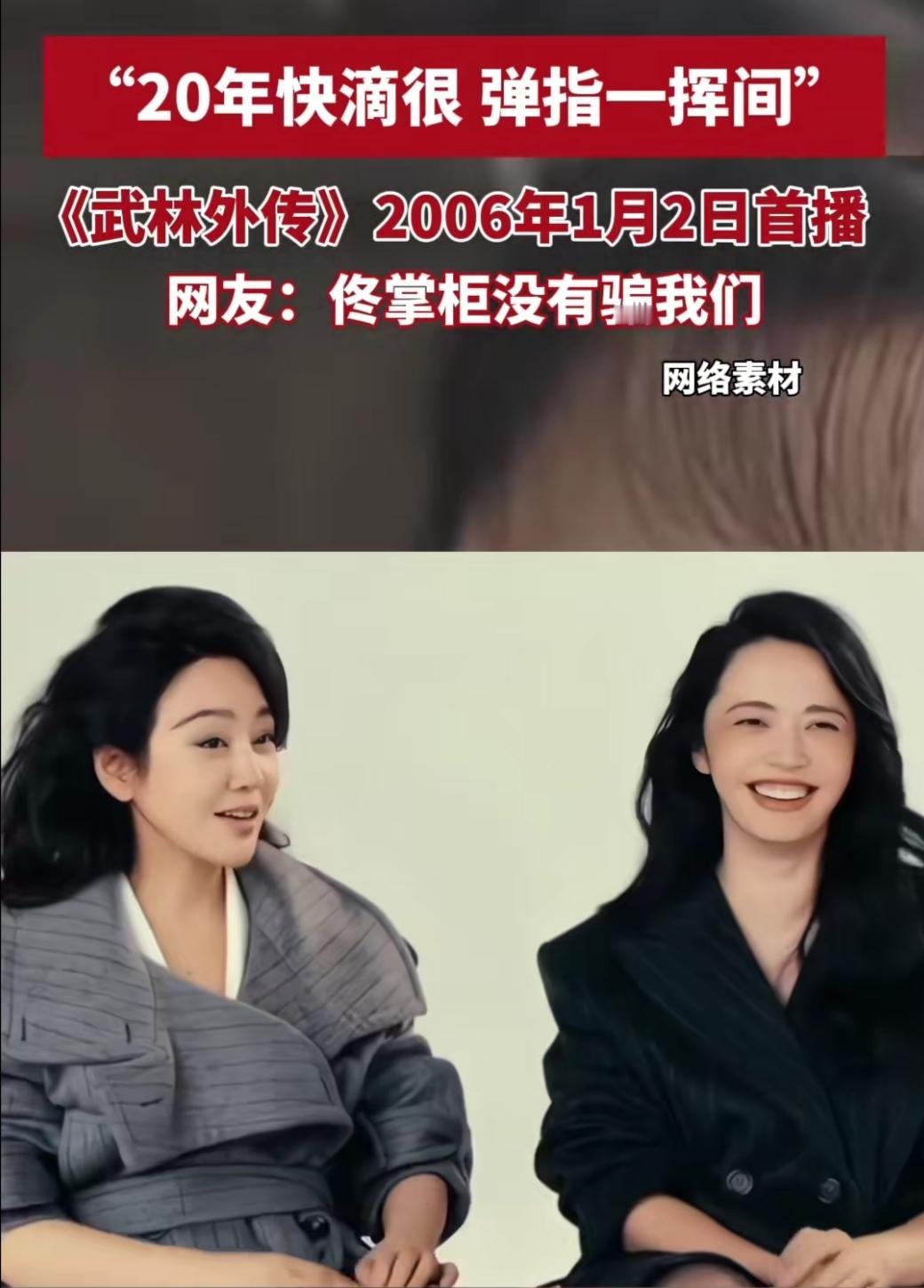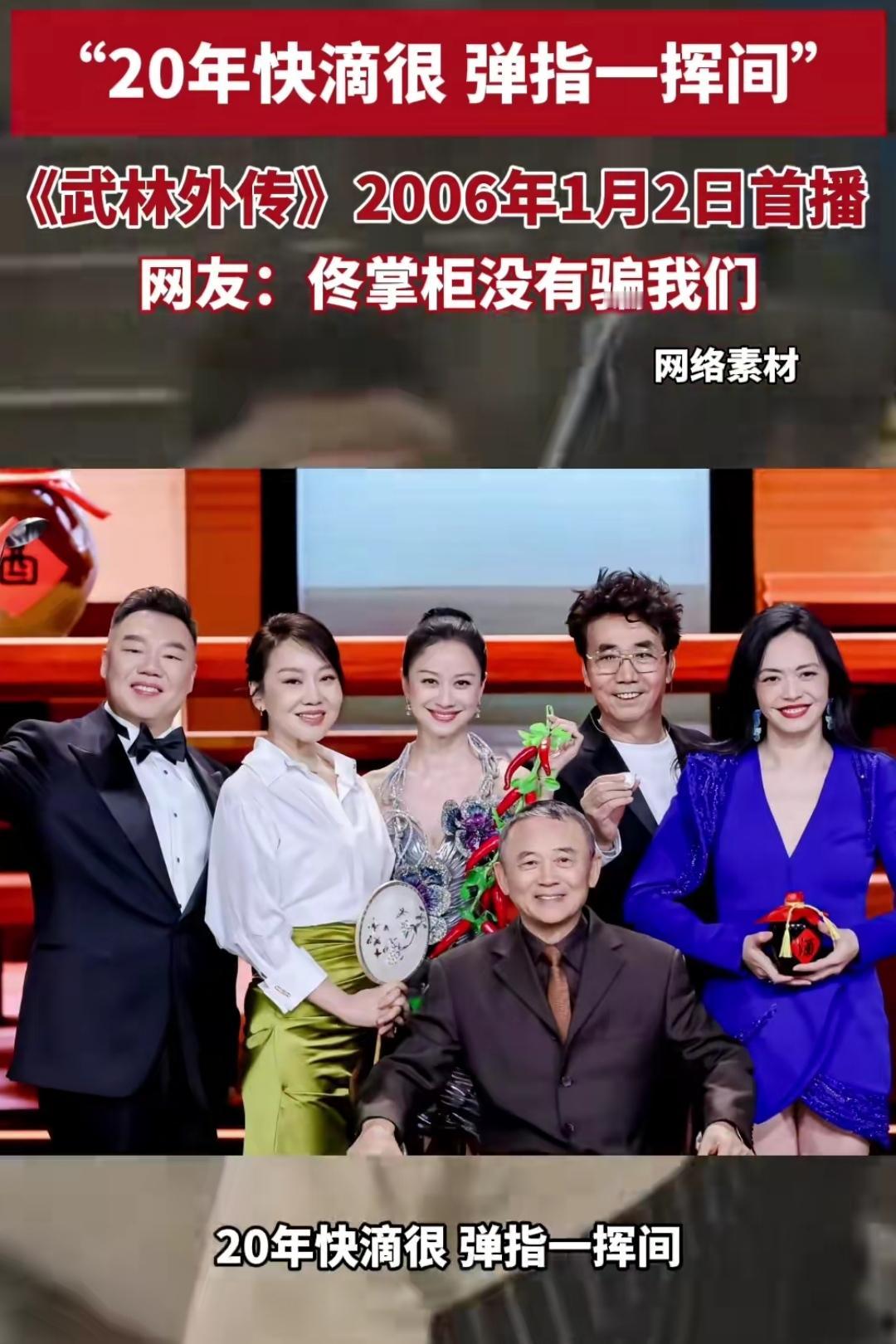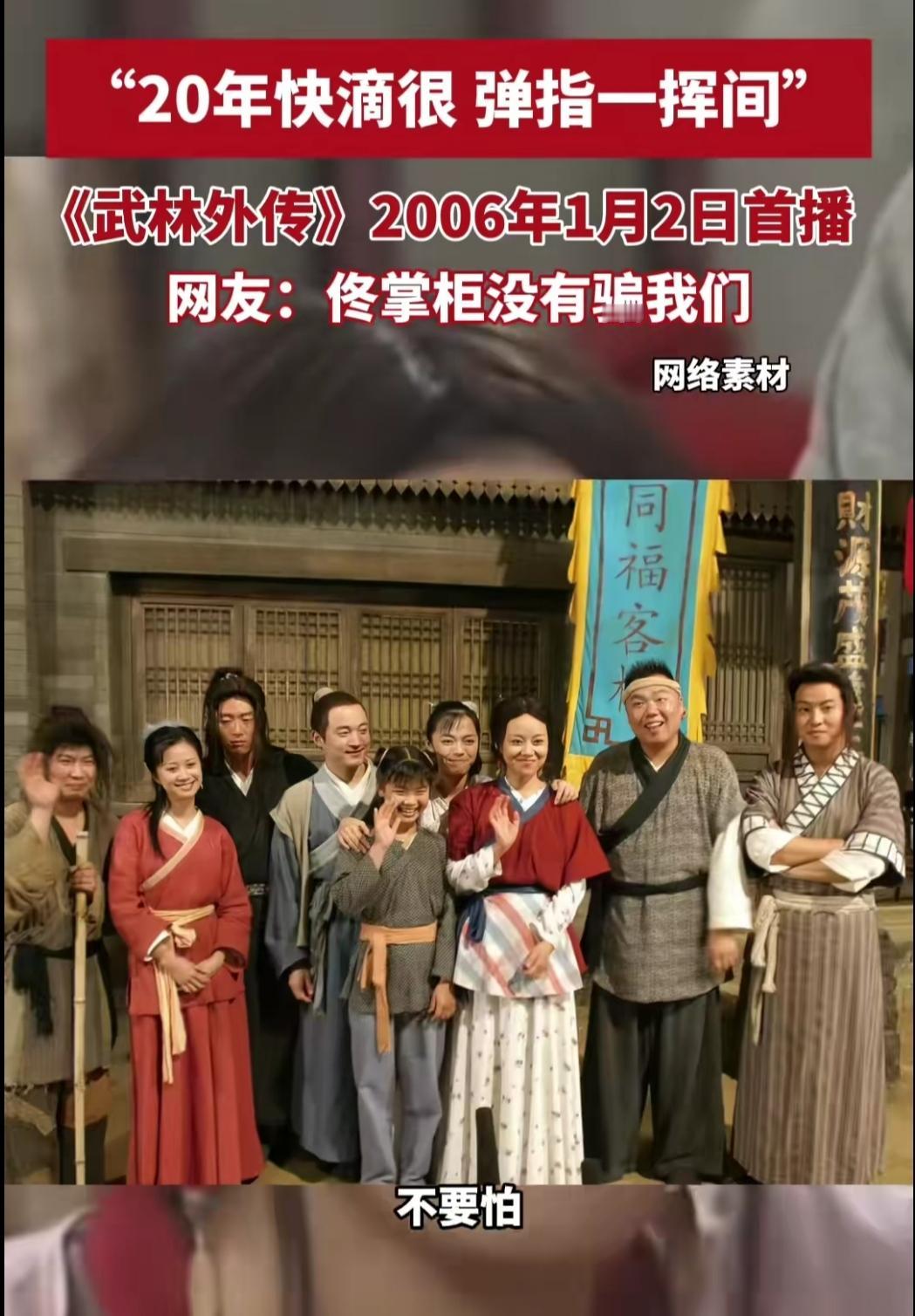 谁能想到,佟掌柜对着老白喊的那句“你还要给我干20年”,一晃真的就到了头。2006年1月2日《武林外传》首播,那时守在电视机前的我们,总觉得20年是遥不可及的漫长岁月,可今天再回头,才懂“弹指一挥间”到底有多真切。 重刷剧里的片段,同福客栈的烟火气还像昨天:佟掌柜的碎碎念、郭芙蓉的“排山倒海”、吕秀才的“子曾经曰过”,还有老白偷摸藏起来的糖人。这些画面曾填满我们的寒暑假,陪着我们从懵懂小孩长成扛起生活的大人。 如今看到剧组重聚的照片,演员们眼角多了细纹,却依旧笑着喊出彼此的角色名,瞬间让人鼻酸。《武林外传》从不是单纯的喜剧,它藏着的江湖,是平凡人的温暖与坚守。20年过去,客栈的门没关,我们的青春也没散,只是那个盼着长大的自己,终于懂了平凡日子里的珍贵。