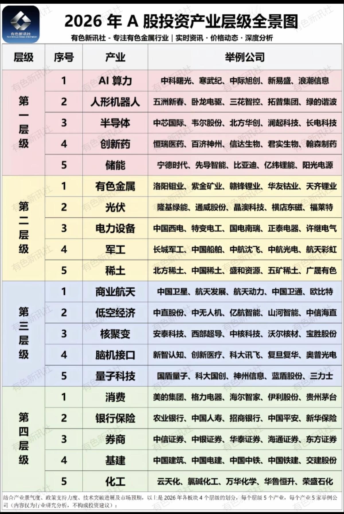 2026年A股投资:产业层级 全景图! 首选还是大科技! 第一层级:大科技(ai算力,芯片封装) 第二层级:有色,光伏,电力,军工 第三层级:商航,低空,脑机接口 第四层级:消费保险,券商