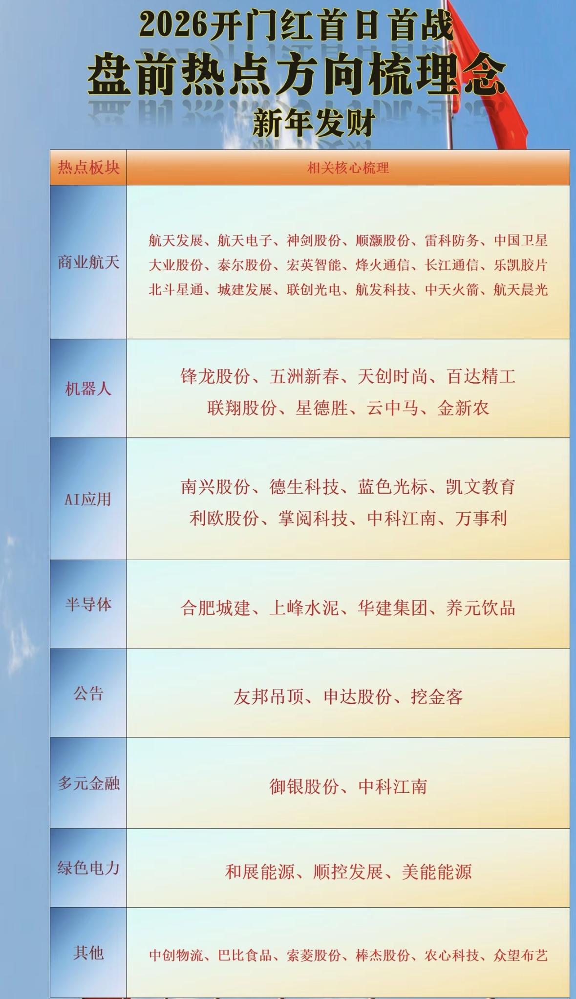 2026开门红首日战盘前热点方向梳理,新年发财! "航天军工领涨开门红, AI与半导体活跃,金融能源多点开花, 跨年行情聚焦科技与基建赛道。"