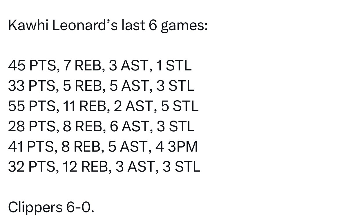 随着快船一波6连胜!!!快船队球员得分情况如下!莱昂纳德:出战23场,场均上场