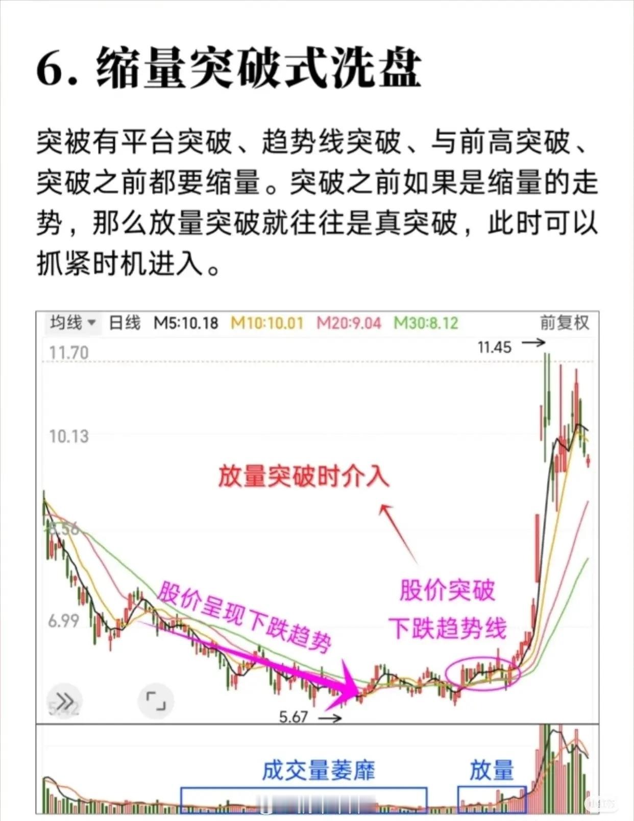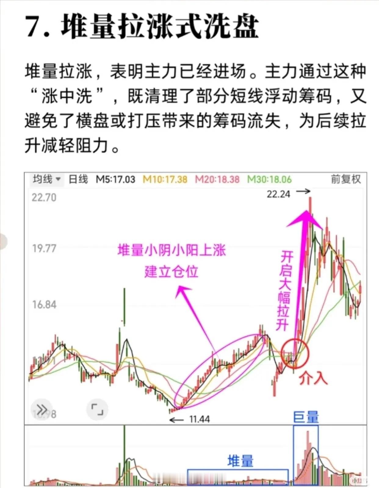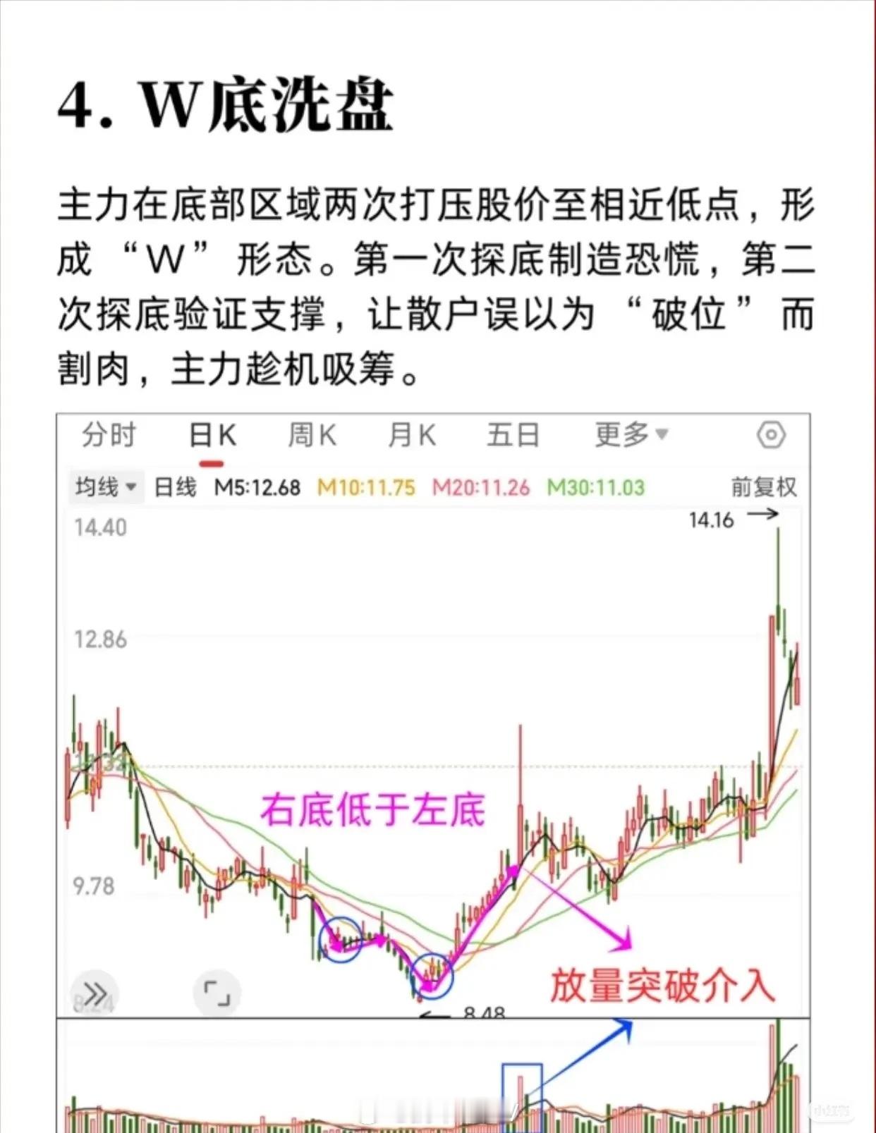 股票主力洗盘结束的技术形态特征,核心内容可简要总结如下:1. 平台式洗盘:底部长期震荡吸筹 → 小幅拉高脱离底部 → 横盘整理洗盘 → 成交量放大突破 → 股价飙升。2. 震荡式洗盘:特定区间内宽幅波动 → K线阴阳交错 → 成交量变化不定 → 洗盘结束放量突破 → 稳步大涨。3. 边拉边洗式洗盘:上涨中穿插小幅回调 → 不破关键均线 → 趋势保持向上 → 持有至连续大阳线拉升止盈。4. W底洗盘:底部两次探底形成“W”形 → 第二次探底验证支撑 → 散户割肉主力吸筹 → 放量突破介入。5. V底洗盘:快速下跌后急速反转 → 多根大阳线 + 成交量骤增 → 低位吸筹强烈反转信号。6. 缩量突破式洗盘:突破前缩量 → 放量突破为真突破 → 可在突破时介入(平台、趋势线、前高等)。7. 堆量拉涨式洗盘:堆量小阴小阳上涨 → 涨中洗盘清理浮筹 → 巨量堆量形成后 → 大幅拉升。共同点:洗盘阶段成交量、K线形态、均线位置都有特征,洗盘结束多伴随放量突破或趋势加速,是介入信号。