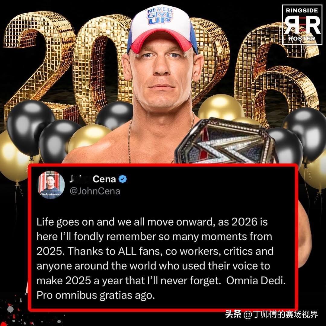 WWE史上最佳选手约翰·塞纳近日在社交媒体上感谢全世界,为他传奇的WWE生涯画上圆满的句号,并正式告别2025年。 塞纳说:“生活仍在继续,我们都在前进。2026年已经到来,我会永远怀念2025年的许多美好瞬间。感谢所有粉丝、同事、评论家以及世界各地所有用自己的声音让2025年成为我永生难忘的一年的人。” 在经历了23年精彩绝伦的岁月、无数难忘的瞬间之后,塞纳带着擂台生涯的圆满落幕迈入2026年,留下了或许无人能及的传奇。 他是所有人的榜样,也是WWE历史上最伟大的选手之一,感谢塞纳的付出,他是真正的冠军。