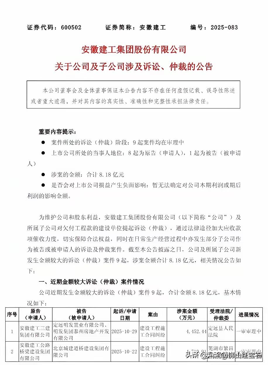 安徽建工最近太猛了,两个月连告 23 家。12 月 16 日发布的公告显示,新增 14 起案件,涉案总额 8.59 亿,均为建设工程施工合同纠纷。追债名单超丰富,住建局、城投公司、高校、医院都在其中。 单笔最大一宗 1.19 亿的案件,是安徽建工固镇房地产开发有限公司起诉固镇县重点工程建设中心与固镇县城市建设投资发展有限责任公司。有人猜测是不是安徽建工经营不行了,其实不然。从三季报看,它总资产 2055.73 亿,前三季度营收 450.26 亿,是实力雄厚的基建巨兽。这次集中维权,是建筑圈回款难问题太严重,它决定不再忍了。