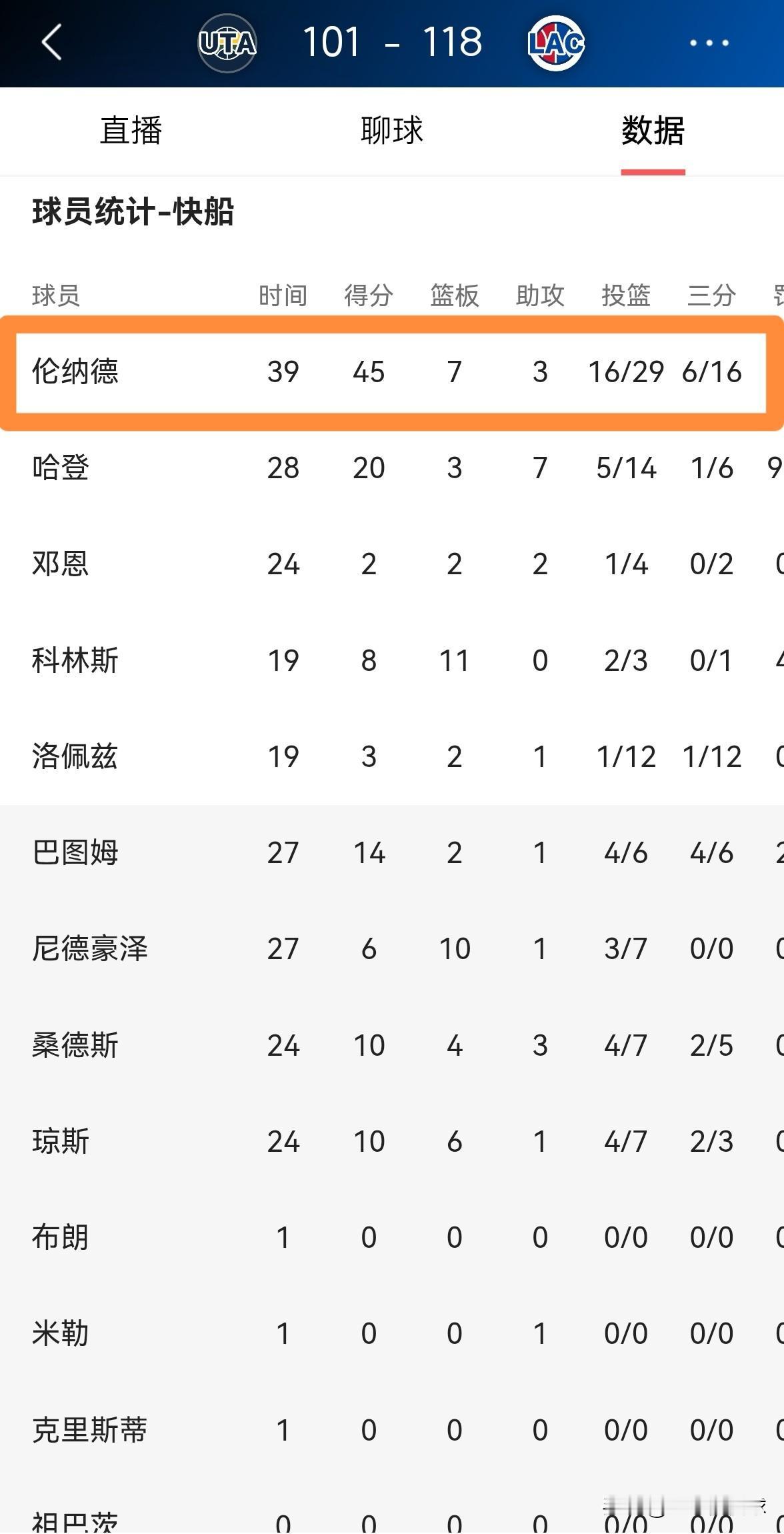 快船当家球星伦纳德真是死神附体,他狂轰45分带队豪取六连胜!今天快船在主场凭借着伦纳德的精彩表现以118:107轻取爵士,豪取六连胜。本场比赛,伦纳德犹如天神下凡一般打出了让人叹为观止的表现,他在首发出战的39分钟里,投篮29中16,其中三分球16中6、罚球9中7爆砍45分7篮板3助攻2抢断2盖帽,他的场上正负值为+8。 最让人感到匪夷所思的是,在第四节比赛中,伦纳德单节比赛爆砍20分,上演了一出极致的个人得分表演,让快船的主场球迷看的非常过瘾。