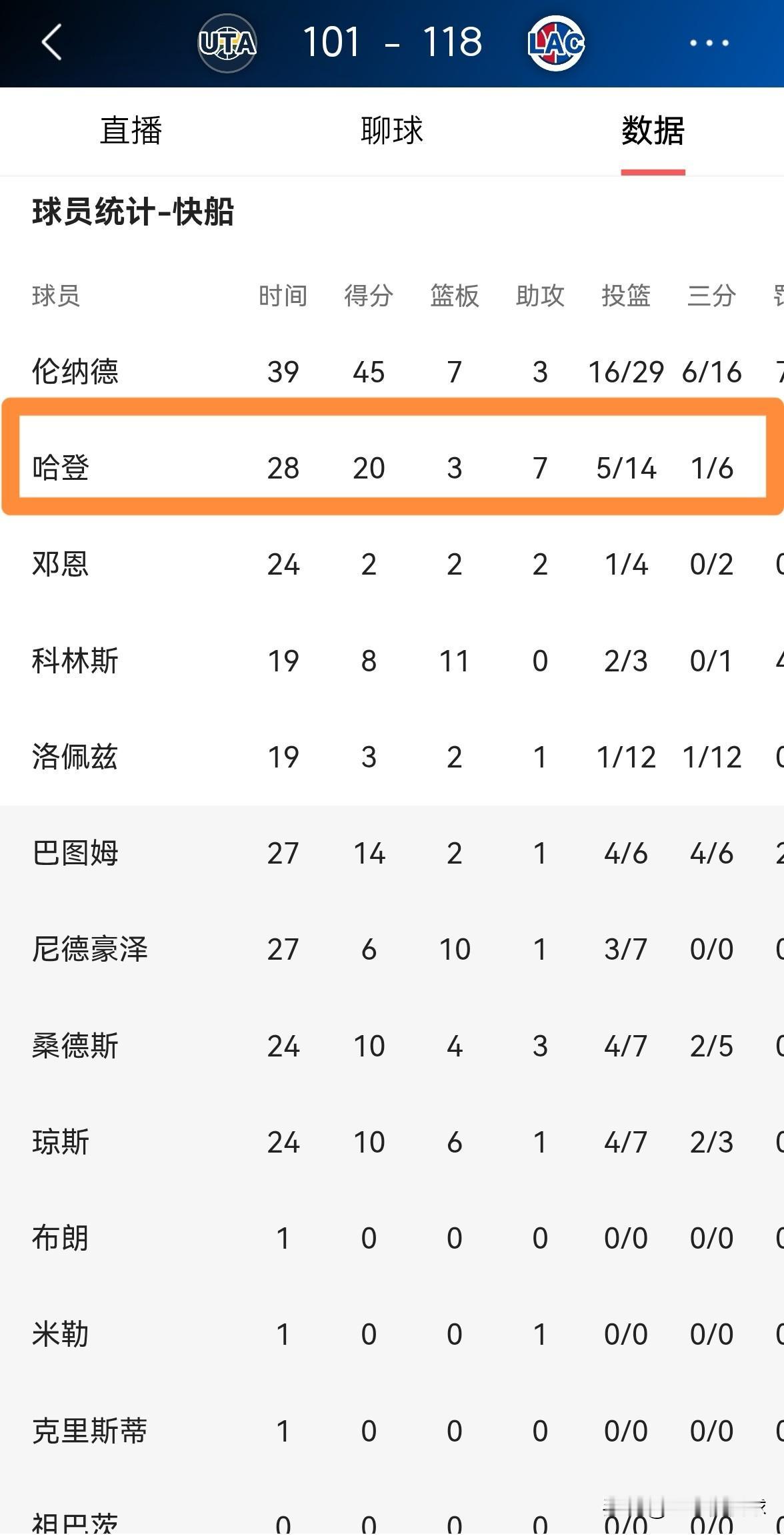 快船主帅泰伦-卢真是吃了熊心豹子胆了,他竟然敢在第四节比赛中弃用哈登!在今天快船主场以118:101击败爵士的比赛中,哈登仅仅首发出战28分钟,投篮14中5,其中三分球6中1、罚球11中9得到20分3篮板7助攻,他的场上正负值为+5。值得注意的是,在关键的第四节比赛中,哈登惨遭主帅泰伦-卢的弃用,因此我非常佩服卢教练的勇气和气魄。