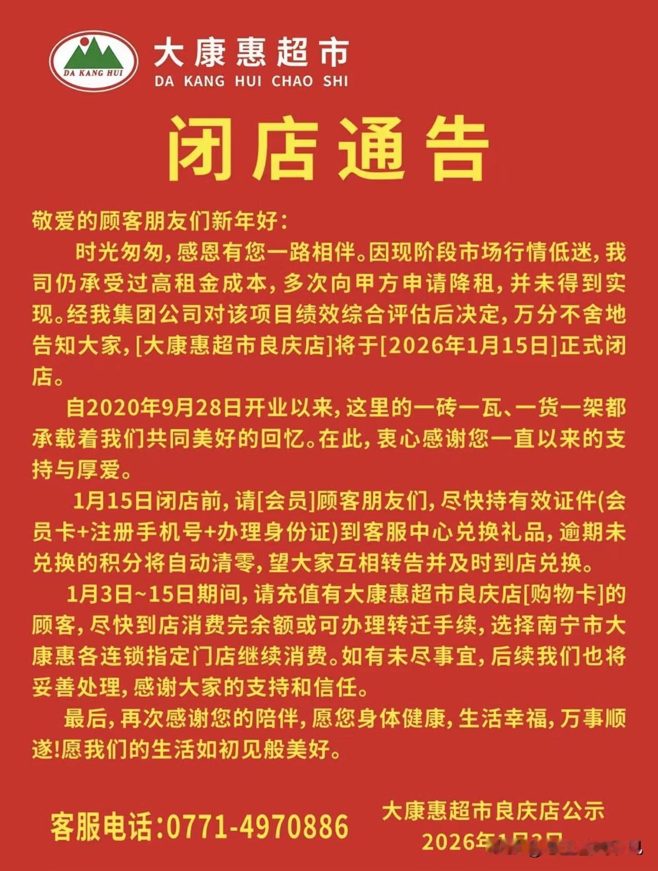 南宁良庆区大康惠超市(良庆店)今天正式贴出闭店通告。仍清晰记得2020年它开业时的盛况——人流涌动,店门口热热闹闹。这一带聚集过三家大型超市,购物选择丰富,而随着大康惠的离开,这片区如今只剩下“超惠达批发超市”仍在坚守。 本以为疫情过后经济会逐步复苏,实体商业也将迎来回暖。可现实却让人感慨:闭店的潮水并未退去,反而愈演愈烈。 南宁身边事 大康惠超市