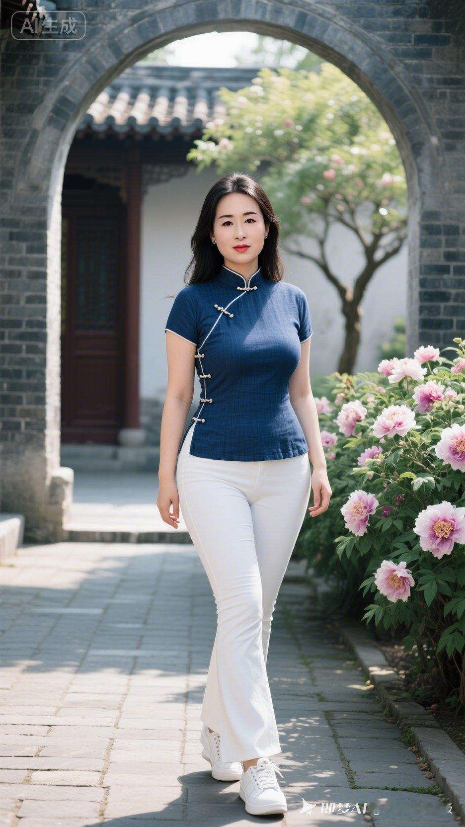 优雅旗袍与现代休闲的完美融合,漫步在古色古香的庭院中。
