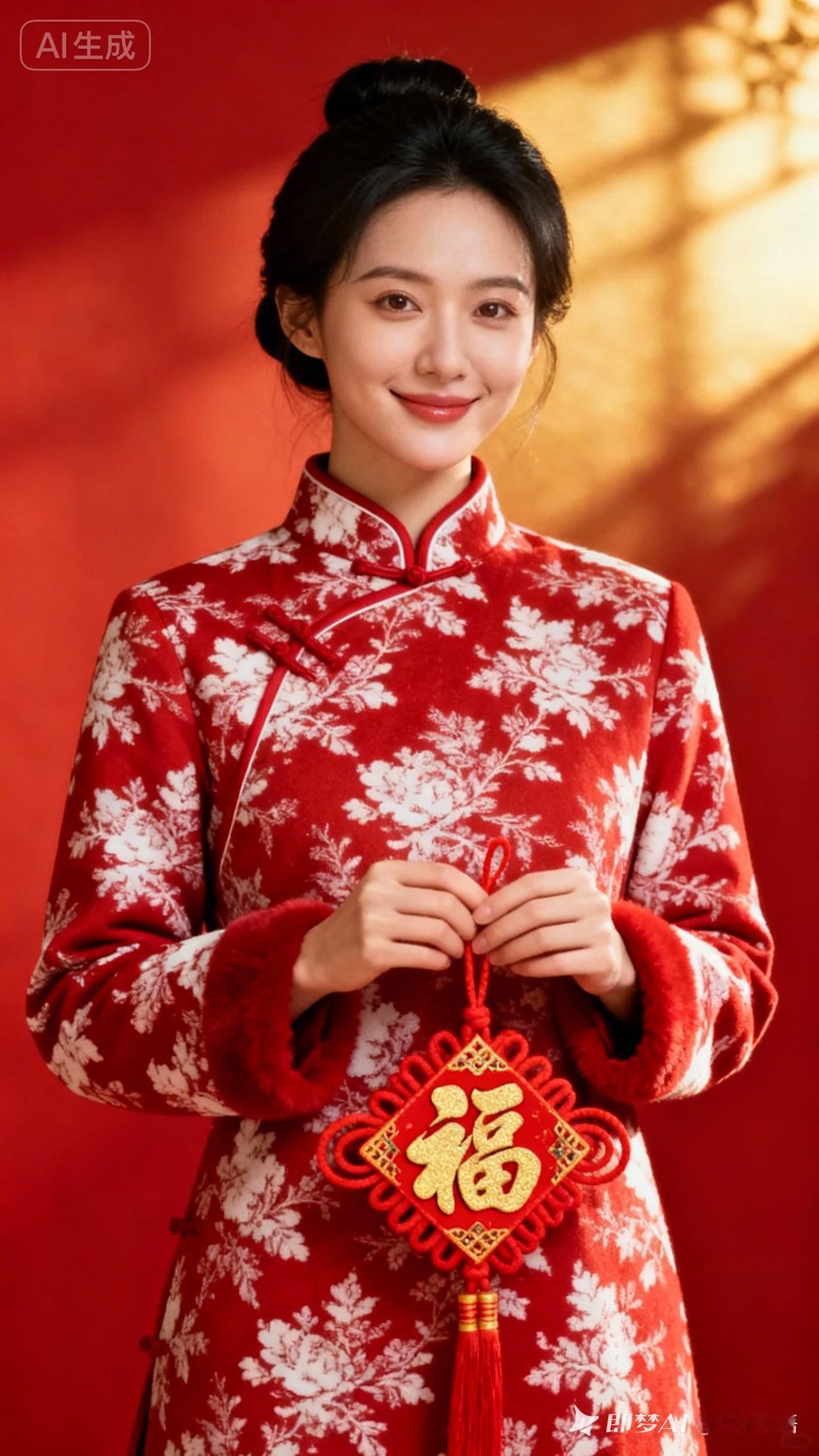 这位小姐姐穿着红色旗袍,手里拿着福字装饰,笑容甜美。