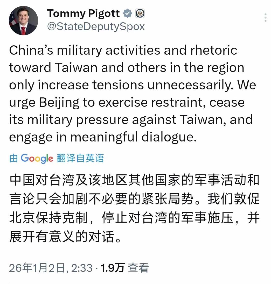 美国国务院:北京应保持克制! 中国大陆在台湾附近举行军事演习,美国国务院副发言人汤米·皮戈特就此发表声明称:“中国针对台湾及其他地区的军事活动和言论不必要地加剧了紧张局势,我们敦促北京保持克制,停止对台军事压力,转而进行有意义的对话。美国支持台海和平稳定,反对单方面改变现状,包括通过武力或胁迫。” 美国这些政客只说三道四、颠倒黑白、混淆是非。台湾是中国的一个省,是中国不可分割的一部分。1943年《开罗宣言》明确规定,日本必须将窃取的中国领土包括台湾、澎湖群岛归还中国;1945年《波茨坦公告》进一步确认“开罗宣言之条件必将实施”。 俄罗斯外长拉夫罗夫说,台湾问题属于中国内政,中方有“完全的法律依据”捍卫其主权和领土完整。 然而美国却对自己的所作所为视而不见,最近美国批准向台湾出售价值约111亿美元的武器,创下对台军售单笔金额最高纪录。可见,是谁破坏台海和平,是谁试图改变台海现状已经一目了然。 美国不断干涉他国内政,已成世界公敌。我们也要认识到,敌人越是反对的,越说明我们做的对,就越要坚持!绝不能让美国的阴谋得逞。