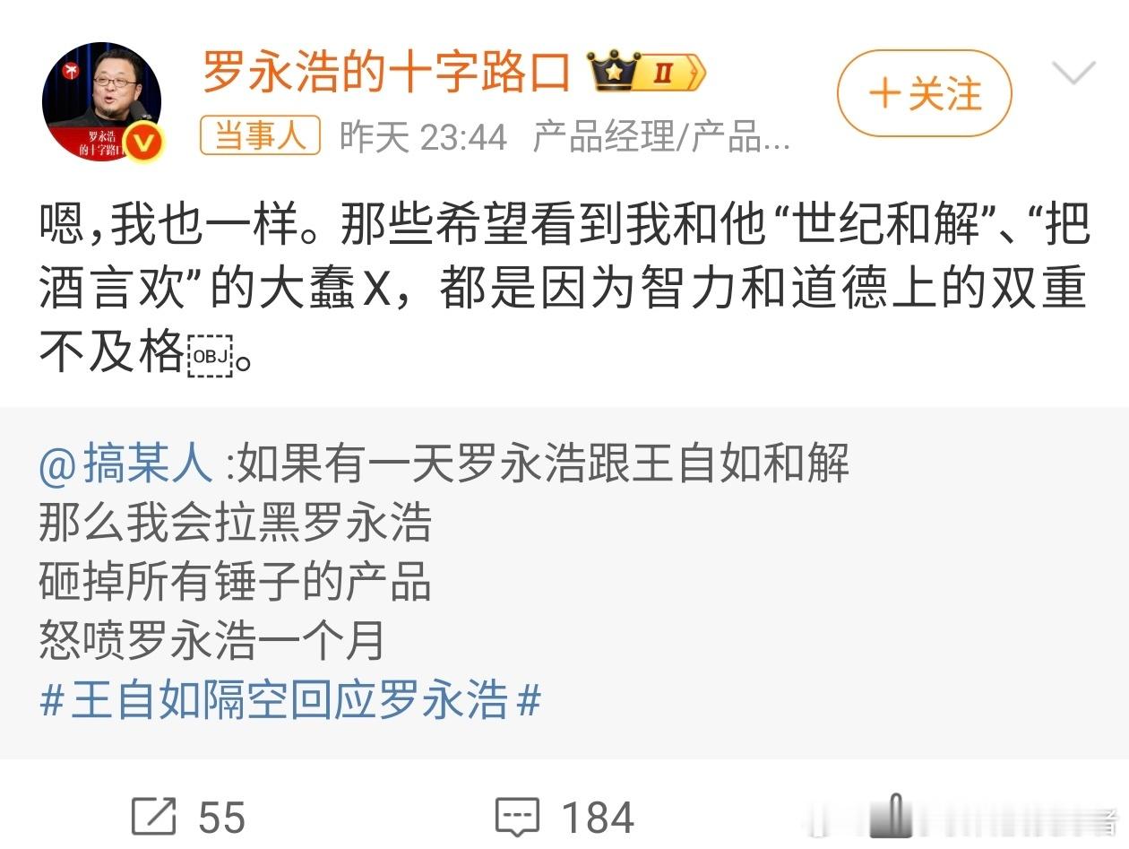 罗永浩回应是否与王自如和解罗永浩和王自如这辈子是不可能和解了,至少从罗永浩的发言来看明面上是不可能。不过,双方争吵流量拉满,热度是有了,也许这也是另一种保持流量的方式。