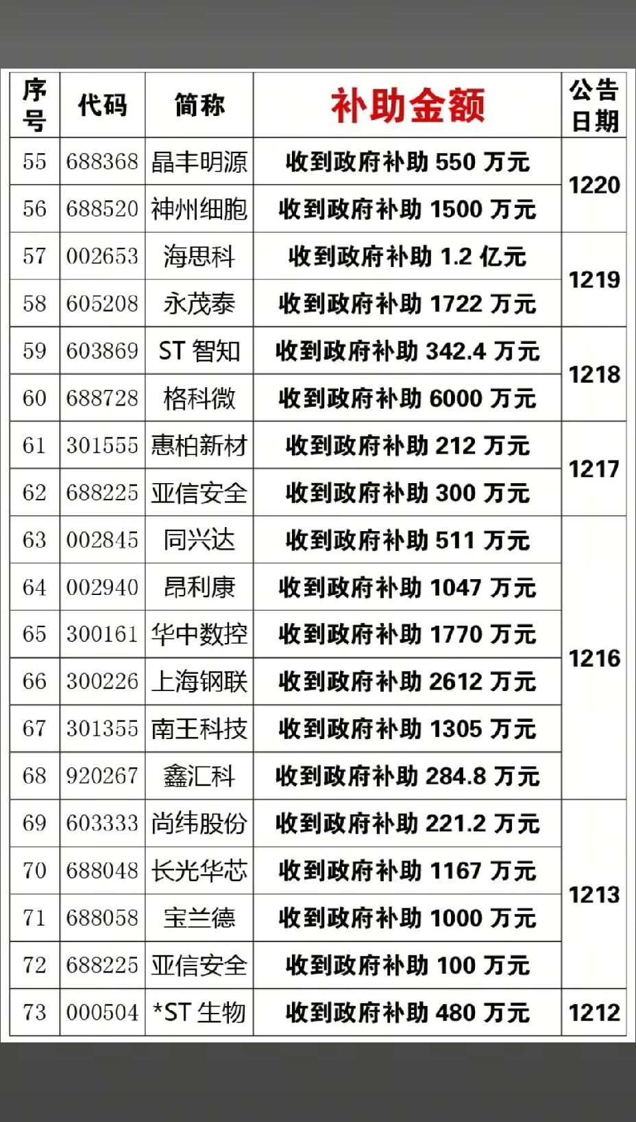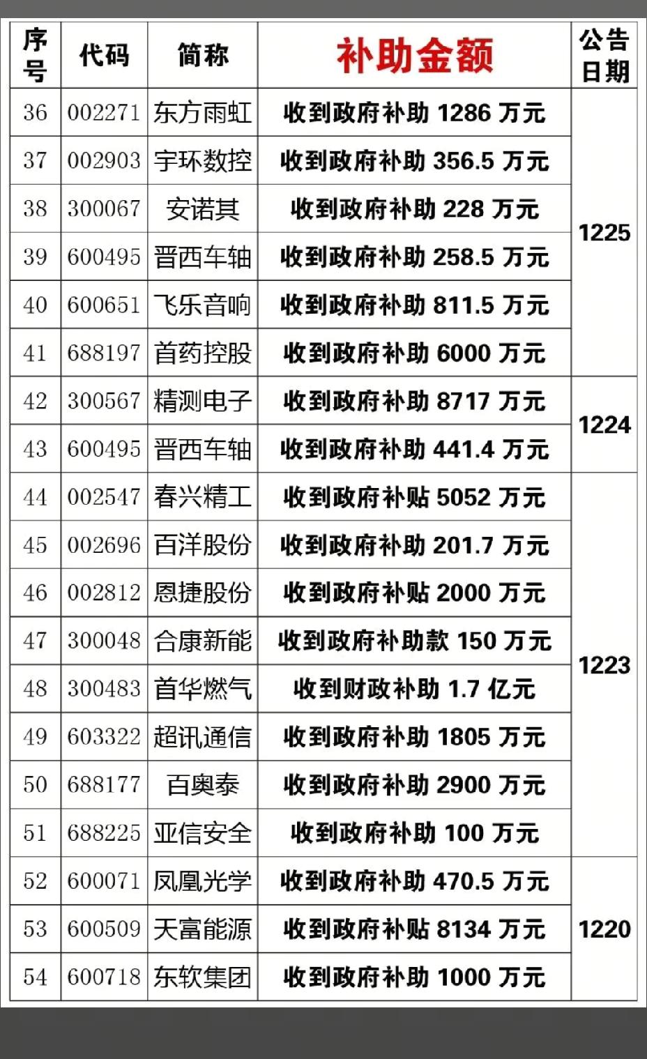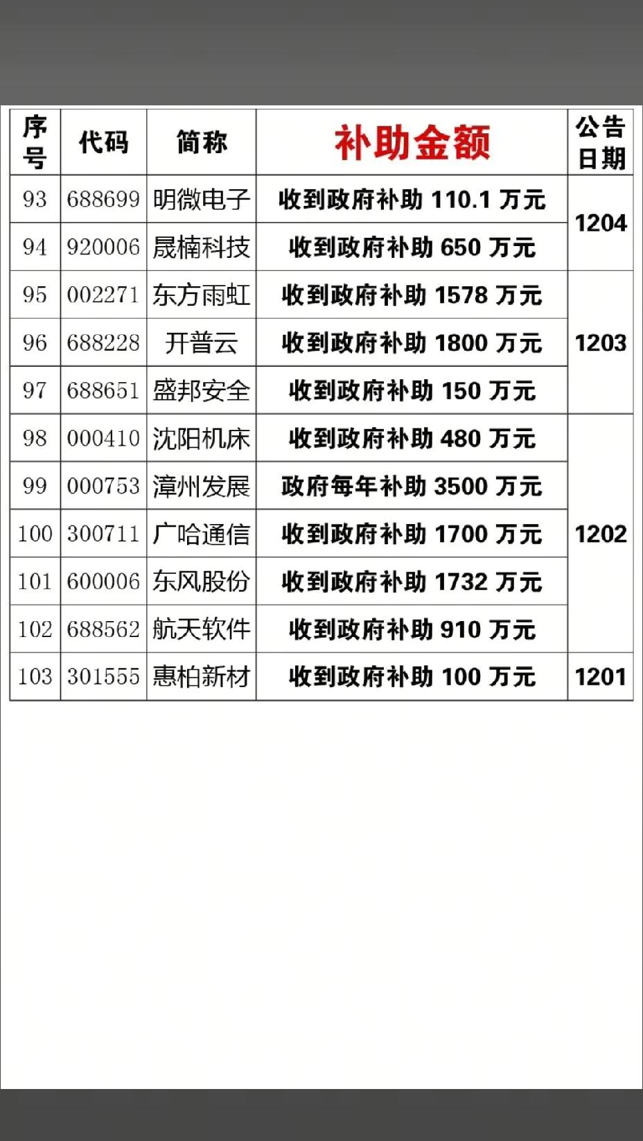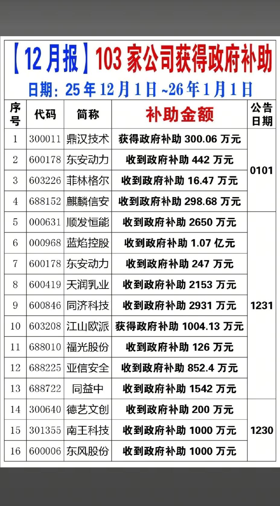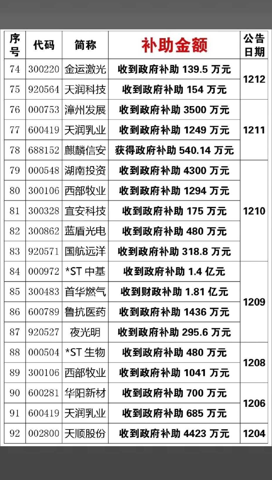 1月1日,节后A股这些公司有望大涨!!! 103家公司获得政府补助,重点关注:蓝焰控股获得政府补助1.07亿,后市值得高看一眼;天润乳业获得政府补助2153万,后市值得期待;山鹰国际获得政府补助7000万 ,后市值得高看一眼!!!