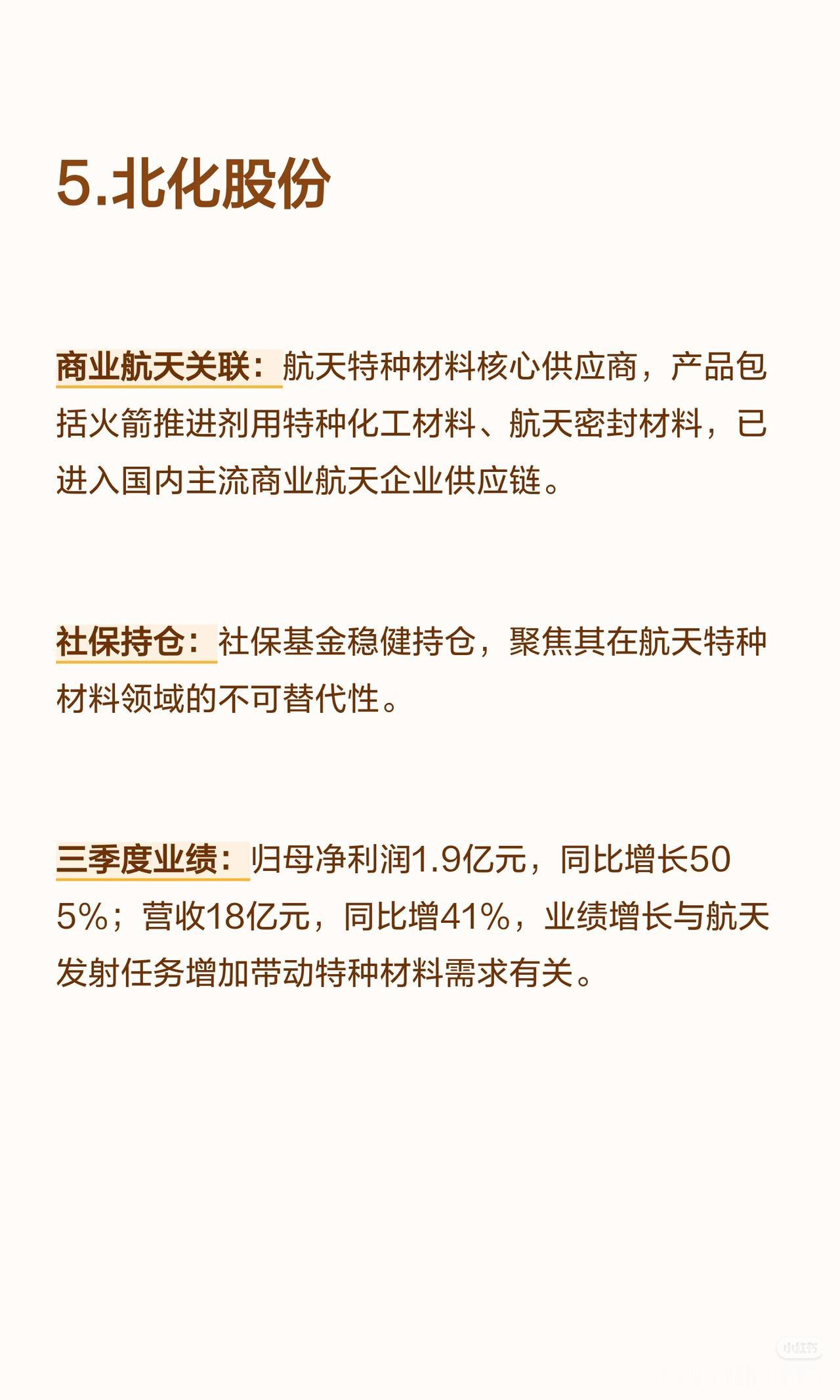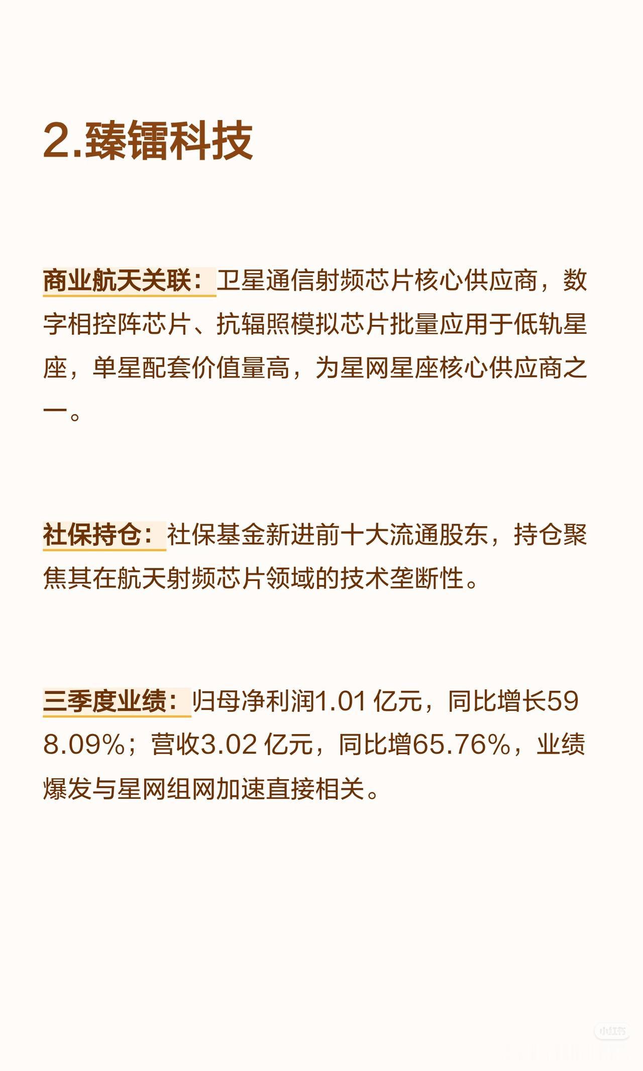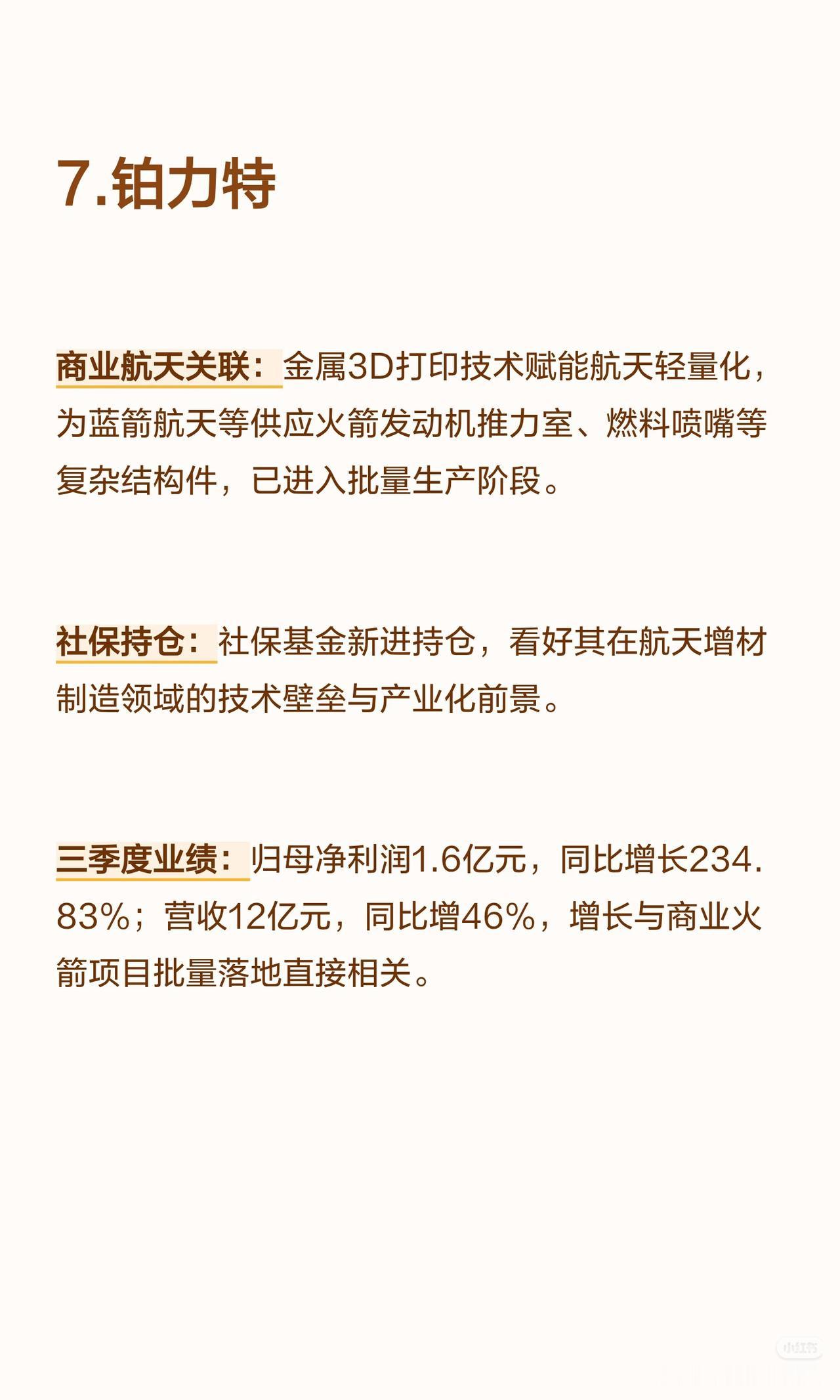 以下是8家商业航天核心公司(含社保持仓及三季度业绩高增长情况)的言简意赅总结: 1. 高德红外 - 商业航天关联:红外热成像技术用于卫星遥感、火箭发射地面监测;子公司布局航天配套红外探测器与制导组件,获低轨卫星项目订单。 - 社保持仓:社保基金位列前十大流通股东(长期配置)。 - 三季度业绩:归母净利润5.8亿元(+1059%),营收31亿元(+69%);增长源于航天配套订单放量+红外产品毛利率提升。 2. 臻镭科技 - 商业航天关联:卫星通信射频芯片核心供应商(数字相控阵/抗辐照模拟芯片批量用于低轨星座,星网星座核心供应商)。 - 社保持仓:社保基金新进前十大流通股东(聚焦技术垄断性)。 - 三季度业绩:归母净利润1.01亿元(+598.09%),营收3.02亿元(+65.76%);增长源于星网组网加速。 3. 华丰科技 - 商业航天关联:宇航级高速连接器龙头(传输速率≥25Gbps,覆盖90%以上商业卫星项目)。 - 社保持仓:社保基金组合持续持仓(认可国产替代地位)。 - 三季度业绩:归母净利润2.2亿元(+558.51%),营收17亿元(+121%);增长源于低轨卫星批量生产带动连接器需求。 4. 兴森科技 - 商业航天关联:PCB基板与航天电子配套服务商(为卫星/火箭提供高可靠性PCB,适配极端环境)。 - 社保持仓:社保基金长期持仓(看重技术积累与客户粘性)。 - 三季度业绩:归母净利润1.3亿元(+516%),营收54亿元(+23%);增长源于航天+高端电子PCB订单双增。 5. 北化股份 - 商业航天关联:航天特种材料核心供应商(产品含火箭推进剂用特种化工材料、航天密封材料,进入主流商业航天企业供应链)。 - 社保持仓:社保基金稳健持仓(聚焦不可替代性)。 - 三季度业绩:归母净利润1.9亿元(+505%),营收18亿元(+41%);增长源于航天发射任务增加带动特种材料需求。 6. 永鼎股份 - 商业航天关联:布局航天光通信设备与超导材料(为卫星地面站提供光通信解决方案,超导技术用于航天能源系统)。 - 社保持仓:社保基金组合增持(认可通信+新材料协同布局)。 - 三季度业绩:归母净利润3.3亿元(+474.3%),营收36亿元(+22%);增长源于航天光通信订单+超导材料业务突破。 7. 铂力特 - 商业航天关联:金属3D打印技术赋能航天轻量化(为蓝箭航天等供应火箭发动机推力室、燃料喷嘴等复杂件,批量生产)。 - 社保持仓:社保基金新进持仓(看好增材制造技术壁垒与产业化前景)。 - 三季度业绩:归母净利润1.6亿元(+234.83%),营收12亿元(+46%);增长源于商业火箭项目批量交付。 8. 苏试试验 - 商业航天关联:商业航天可靠性检测龙头(提供卫星/火箭结构件/电子设备环境可靠性试验,覆盖主流企业)。 - 社保持仓:社保基金联合持仓(认可检测领域稀缺性与增长确定性)。 - 三季度业绩:归母净利润同比+超50%,营收同比+30%以上;增长源于商业航天发射频次增加带动检测需求。 核心共性:8家公司均深度参与商业航天产业链(覆盖红外、芯片、连接器、材料、光通信、3D打印、检测等领域),且均获社保基金持仓(长期/新进/增持),三季度业绩均实现超高速增长(净利润增速均超200%,部分超1000%)。