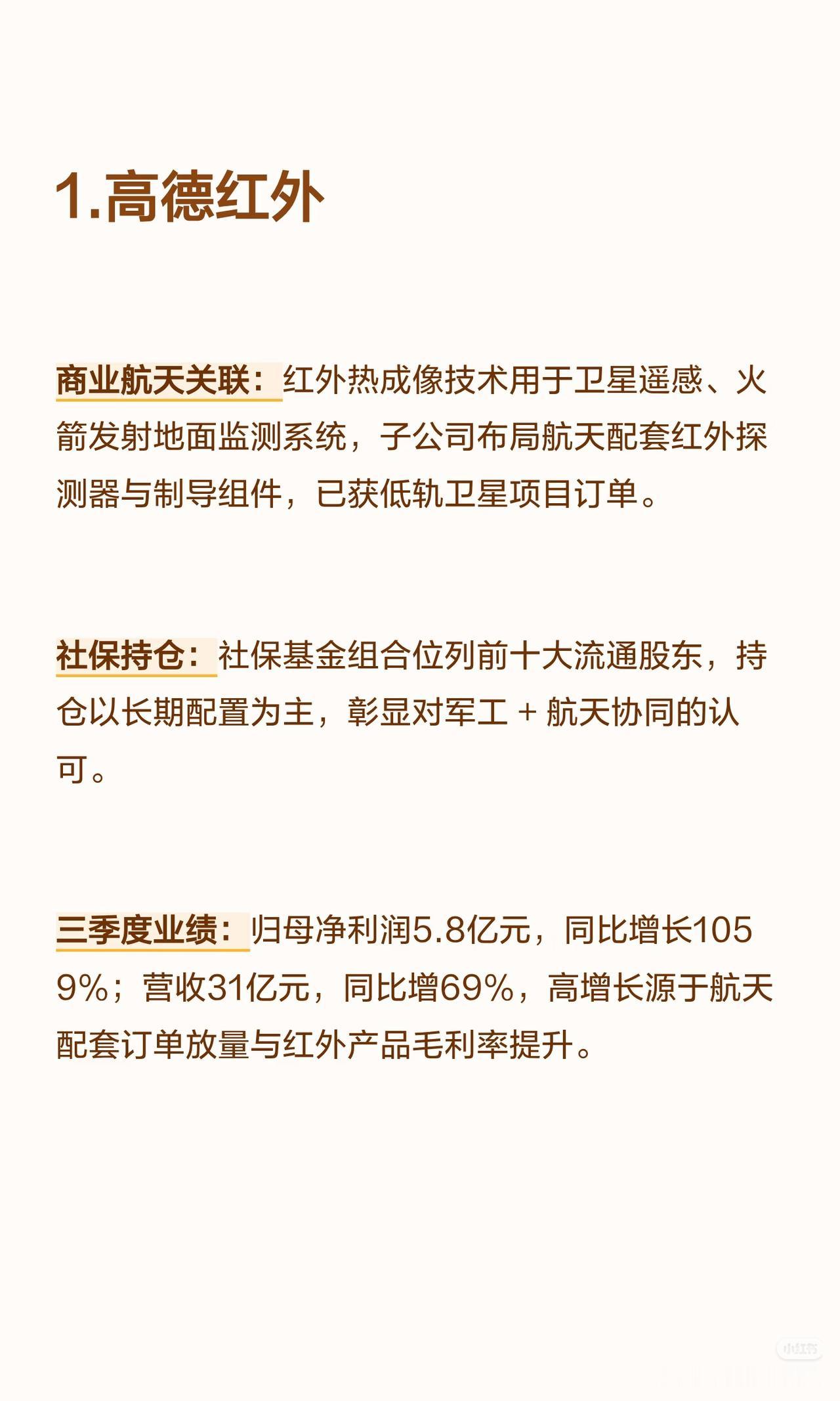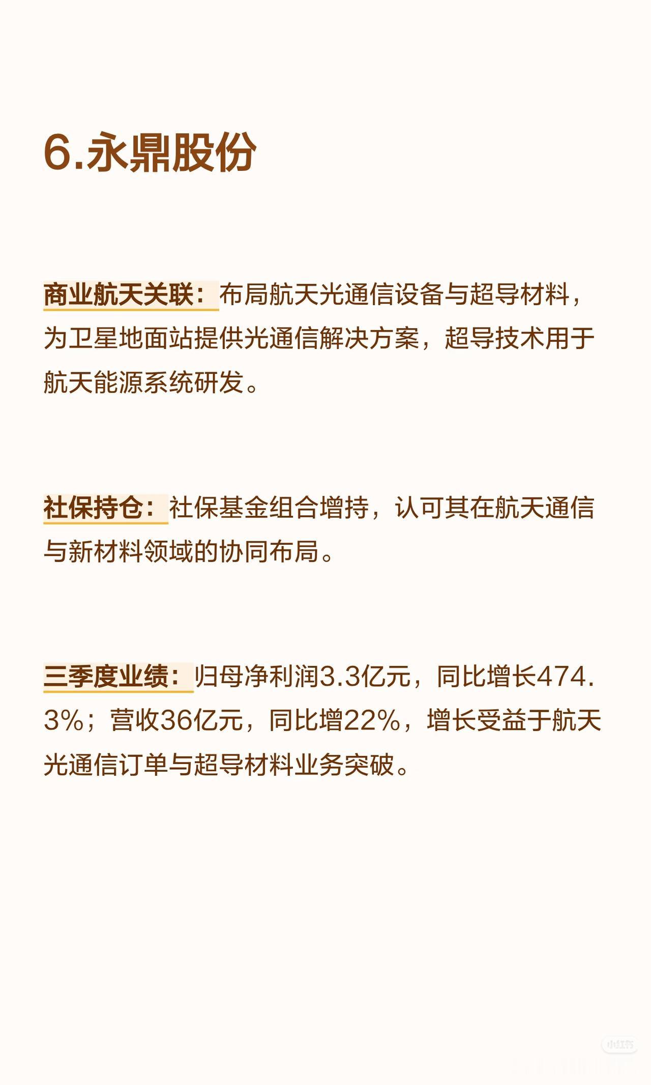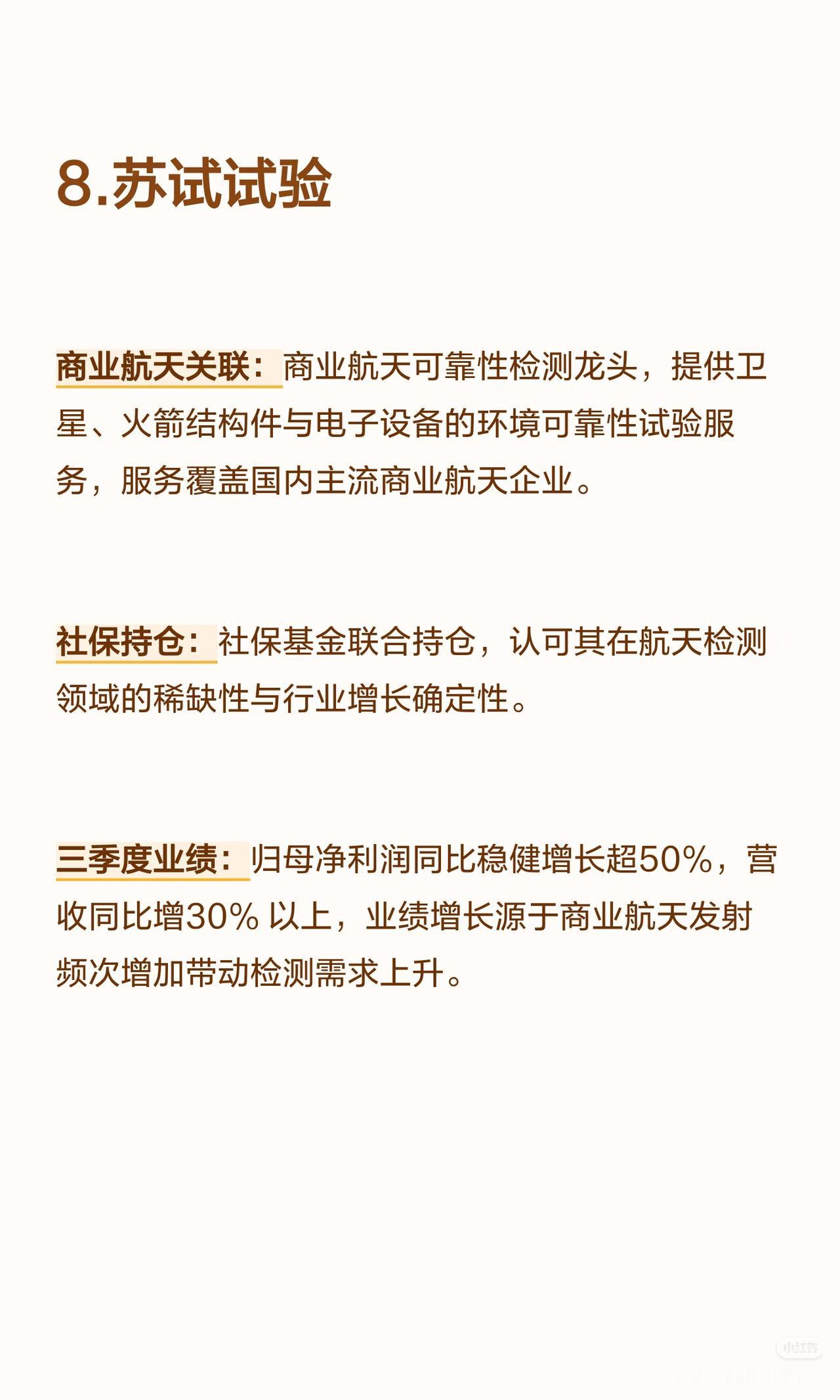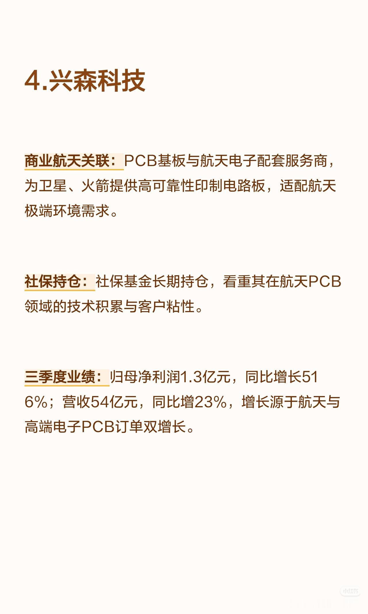 以下是8家商业航天核心公司(含社保持仓及三季度业绩高增长情况)的言简意赅总结: 1. 高德红外 - 商业航天关联:红外热成像技术用于卫星遥感、火箭发射地面监测;子公司布局航天配套红外探测器与制导组件,获低轨卫星项目订单。 - 社保持仓:社保基金位列前十大流通股东(长期配置)。 - 三季度业绩:归母净利润5.8亿元(+1059%),营收31亿元(+69%);增长源于航天配套订单放量+红外产品毛利率提升。 2. 臻镭科技 - 商业航天关联:卫星通信射频芯片核心供应商(数字相控阵/抗辐照模拟芯片批量用于低轨星座,星网星座核心供应商)。 - 社保持仓:社保基金新进前十大流通股东(聚焦技术垄断性)。 - 三季度业绩:归母净利润1.01亿元(+598.09%),营收3.02亿元(+65.76%);增长源于星网组网加速。 3. 华丰科技 - 商业航天关联:宇航级高速连接器龙头(传输速率≥25Gbps,覆盖90%以上商业卫星项目)。 - 社保持仓:社保基金组合持续持仓(认可国产替代地位)。 - 三季度业绩:归母净利润2.2亿元(+558.51%),营收17亿元(+121%);增长源于低轨卫星批量生产带动连接器需求。 4. 兴森科技 - 商业航天关联:PCB基板与航天电子配套服务商(为卫星/火箭提供高可靠性PCB,适配极端环境)。 - 社保持仓:社保基金长期持仓(看重技术积累与客户粘性)。 - 三季度业绩:归母净利润1.3亿元(+516%),营收54亿元(+23%);增长源于航天+高端电子PCB订单双增。 5. 北化股份 - 商业航天关联:航天特种材料核心供应商(产品含火箭推进剂用特种化工材料、航天密封材料,进入主流商业航天企业供应链)。 - 社保持仓:社保基金稳健持仓(聚焦不可替代性)。 - 三季度业绩:归母净利润1.9亿元(+505%),营收18亿元(+41%);增长源于航天发射任务增加带动特种材料需求。 6. 永鼎股份 - 商业航天关联:布局航天光通信设备与超导材料(为卫星地面站提供光通信解决方案,超导技术用于航天能源系统)。 - 社保持仓:社保基金组合增持(认可通信+新材料协同布局)。 - 三季度业绩:归母净利润3.3亿元(+474.3%),营收36亿元(+22%);增长源于航天光通信订单+超导材料业务突破。 7. 铂力特 - 商业航天关联:金属3D打印技术赋能航天轻量化(为蓝箭航天等供应火箭发动机推力室、燃料喷嘴等复杂件,批量生产)。 - 社保持仓:社保基金新进持仓(看好增材制造技术壁垒与产业化前景)。 - 三季度业绩:归母净利润1.6亿元(+234.83%),营收12亿元(+46%);增长源于商业火箭项目批量交付。 8. 苏试试验 - 商业航天关联:商业航天可靠性检测龙头(提供卫星/火箭结构件/电子设备环境可靠性试验,覆盖主流企业)。 - 社保持仓:社保基金联合持仓(认可检测领域稀缺性与增长确定性)。 - 三季度业绩:归母净利润同比+超50%,营收同比+30%以上;增长源于商业航天发射频次增加带动检测需求。 核心共性:8家公司均深度参与商业航天产业链(覆盖红外、芯片、连接器、材料、光通信、3D打印、检测等领域),且均获社保基金持仓(长期/新进/增持),三季度业绩均实现超高速增长(净利润增速均超200%,部分超1000%)。