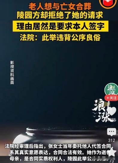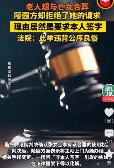 女子独生女儿去世,她悲痛到无力处理后事,便委托亲戚去办理墓地事宜,还和陵园签了合墓合同,想着以后和女儿合葬。多年后,她患偏瘫行动不便,想提前办理合墓使用权手续,陵园却以合同签字非她本人,要求原经办人办理变更手续为由拒绝。她交涉无果后起诉了陵园,最终法院判她享有合墓使用权。 (来源:浪涨新闻) 张大妈这辈子,心里眼里全是她那独生女儿。她一直盼着,等自己老了,能和女儿相互依靠,安享晚年。 可女儿突然离世的消息,使张大妈整个人瞬间垮了,哭得嗓子都哑了。 女儿走了,可后事还得处理。 张大妈实在太伤心了,根本没力气去操办这些事,她只能委托亲戚去给女儿买了一块能合葬的墓地。 亲戚办事也利索,很快就和陵园签了合墓合同。 张大妈虽然当时很伤心,但心里还是记着这事,她想着,等自己百年之后,能和女儿葬在一起,也算是有个伴。 张大妈的年龄也越来越大,行动变得特别艰难,有时候还得靠别人帮忙。 张大妈怕自己突然有一天就走了,到时候连合墓的手续都没办好,那可怎么办?她决定提前去把合墓使用权的手续办好。 她让家人陪着她来到了陵园,她以为手续很快就能办好,可没想到,陵园的工作人员却告诉她,因为合同不是她本人签字的,要原经办人来办理变更手续,不然不能给她办。 张大妈跟工作人员解释,自己当时实在太伤心,没力气来签字,才委托亲戚办的。 而且这么多年过去了,亲戚也不一定还记得这事,上哪去找哈? 可陵园的工作人员,根本不听她的解释,坚持要原经办人来。 张大妈没办法,只能让家人联系亲戚。 可亲戚也犯了难,这么多年过去了,很多事情都变了,要找当时的证据和手续,谈何容易? 张大妈不甘心,她一次又一次地来到陵园,跟工作人员交涉,她诉说着自己的遭遇,希望他们能通融通融。 可陵园的工作人员,始终不为所动,还是那句话,要原经办人来。 张大妈只是想在将来能和女儿葬在一起,这个要求过分吗?为什么就这么难实现呢? 交涉了无数次,都没有结果。张大妈起诉了陵园,她觉得,自己一定要为自己讨个公道。 陵园方,一直坚持自己的观点,说合同不是张大妈本人签字,手续不合法。 张大妈也拿出了各种证据,证明自己当时是因为特殊情况才委托亲戚签字的,而且自己一直认可这份合同。 从法律角度来讲,虽然合同上签字不是张大妈本人,但张大妈委托亲戚签订合同,这属于委托代理行为。 根据《民法典》第一百六十一条规定,民事主体可以通过代理人实施民事法律行为。代理人在代理权限内,以被代理人名义实施的民事法律行为,对被代理人发生效力。 在这个事里,亲戚是在张大妈授权的范围内,以张大妈的名义和陵园签订的合墓合同,张大妈也认可这份合同,所以这份合同是合法有效的,张大妈就是合同的权利人,享有合墓使用权。 陵园不能仅仅因为签字不是张大妈本人,就拒绝为她办理手续,这明显是没有法律依据的。 经过一番审理,法院最终认定,张大妈是合同的权利人,享有合墓使用权。陵园方要在规定的时间内,为张大妈办理好相关手续。 张大妈终于可以放心了,自己死后能和女儿葬在一起了。 陵园方也表示,会遵守法院的判决,主动上门为张大妈办理手续。 有人觉得,陵园的做法太不人性化了,张大妈当时那么伤心,委托亲戚签字也是情有可原的,陵园不应该这么死板。 也有人觉得,陵园按照规定办事也没有错,毕竟合同签字是很严肃的事情。 您对这件事有什么看法呢?