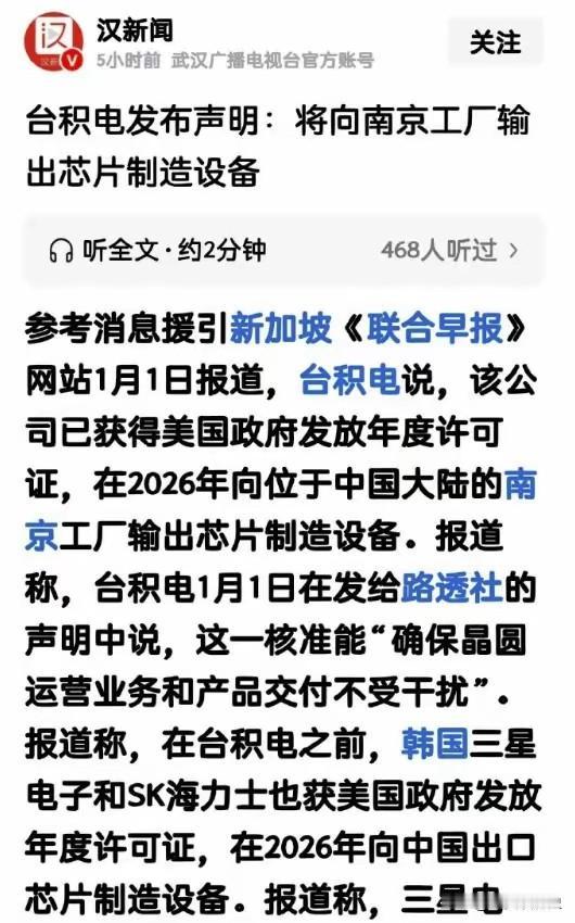 据新加坡《联合早报》报道,台积电称已获得美国政府发放年度许可证,在2026年向位于中国大陆的南京工厂输出芯片制造设备,这一核准能“确保晶圆运营业务和产品交付不受干扰”。不仅是台积电,三星电子和SK海力士都获得了核准。 消息一出,很多人觉得松了口气,甚至认为美国的芯片铁幕似乎松开了一道缝。但我们得往深里瞧瞧,这道缝隙透出的光,到底是真的阳光,还是别有用心的手电筒。 美国政府这手“年度许可证”玩得相当高明。它不是彻底开闸放水,而是精心设计的水龙头。给你点水流,保证工厂不渴死,但阀门始终牢牢攥在自己手里。今年可以,明年呢?后年呢?这就是悬在企业头上的达摩克利斯之剑,随时可以落下。 华盛顿的心思根本藏不住。他们真正要卡死的,是那些能够帮助中国突破尖端制程的设备和技术。南京工厂主要生产的是相对成熟的28纳米及更早工艺的芯片。这些技术中国自己已经有相当基础,全球市场需求又极其庞大。完全掐断,首先疼的是依赖这些芯片的美国及全球汽车、家电等产业。 这本质上是一场利益权衡后的精准手术。美国芯片设备巨头们,如应用材料、泛林集团,在中国市场有着数百亿美元的年销售额。一纸禁令彻底封死,这些美国企业会比中国企业更早倒下。政客可以喊口号,但资本家和股东们要的是真金白银。 看看获得许可的名单就明白了。台积电、三星、SK海力士,清一色是在华有重大生产投资的外资巨头。保住它们在华工厂的正常运转,实质上是保住了全球芯片供应链最低限度的稳定。这与其说是对中国的“恩惠”,不如说是美国为自己主导的全球产业链“排雷”。 我们必须清醒,这绝不意味着技术封锁的终结。针对16/14纳米以下先进制程、EUV光刻机等核心领域的围堵,只会越来越紧。美国正联合日本、荷兰打造一个排除中国的“芯片同盟”,这次放行成熟工艺,恰恰是为了集中火力,在更关键的战役上拖住中国突围的脚步。 对中国半导体产业来说,这既是喘息之机,更是警醒之钟。它再次证明,庞大而稳定的市场需求,是我们最强大的战略筹码。全球七成以上的芯片需求其实集中在成熟制程,这正是我们的主场。守住并扩大这个基本盘,就能赢得宝贵的时间和空间。 但绝不能因此产生幻觉。许可证带来的“确定感”是脆弱的,随时可能被政治风浪撕碎。真正的“业务不受干扰”,只能靠我们自己的手,造出自己的设备,建起自主可控的产线。别人的水龙头,控制权永远在别人手里。 这出戏还没演完。2026年的许可,更像是一个观察哨。美国在试探,在评估,也在为下一步更极致的竞争储备弹药。芯片战争进入了更复杂、更持久的相持阶段,每一份看似放松的文件背后,都写满了算计。 各位读者你们怎么看?欢迎在评论区讨论。 台积电 台积电美国工厂 美国台积电 台积电市值 台积电泄密 台积电断芯