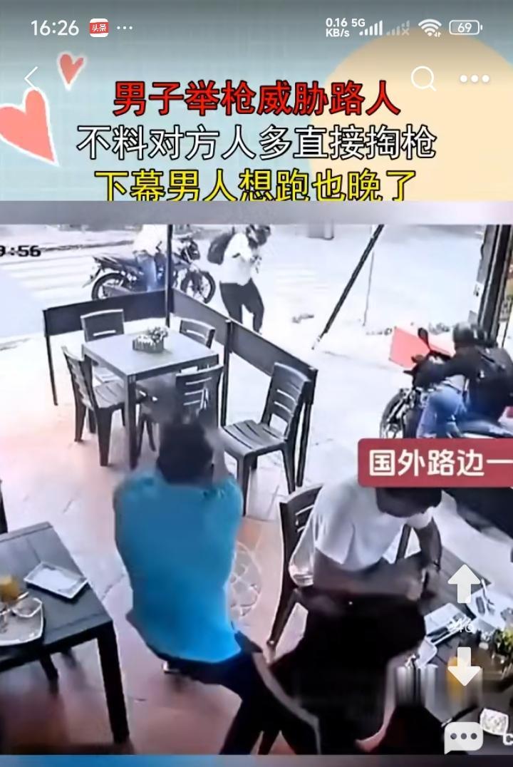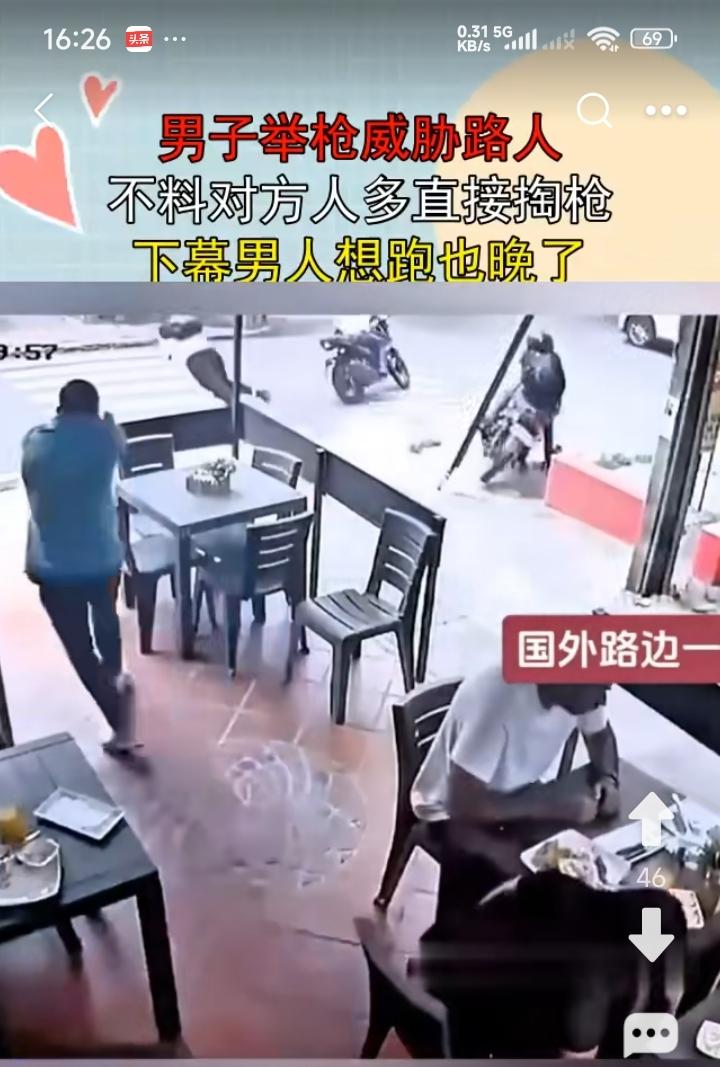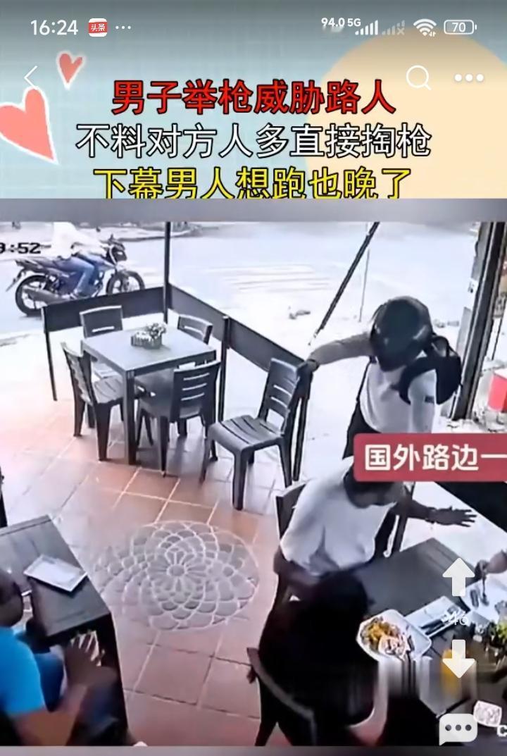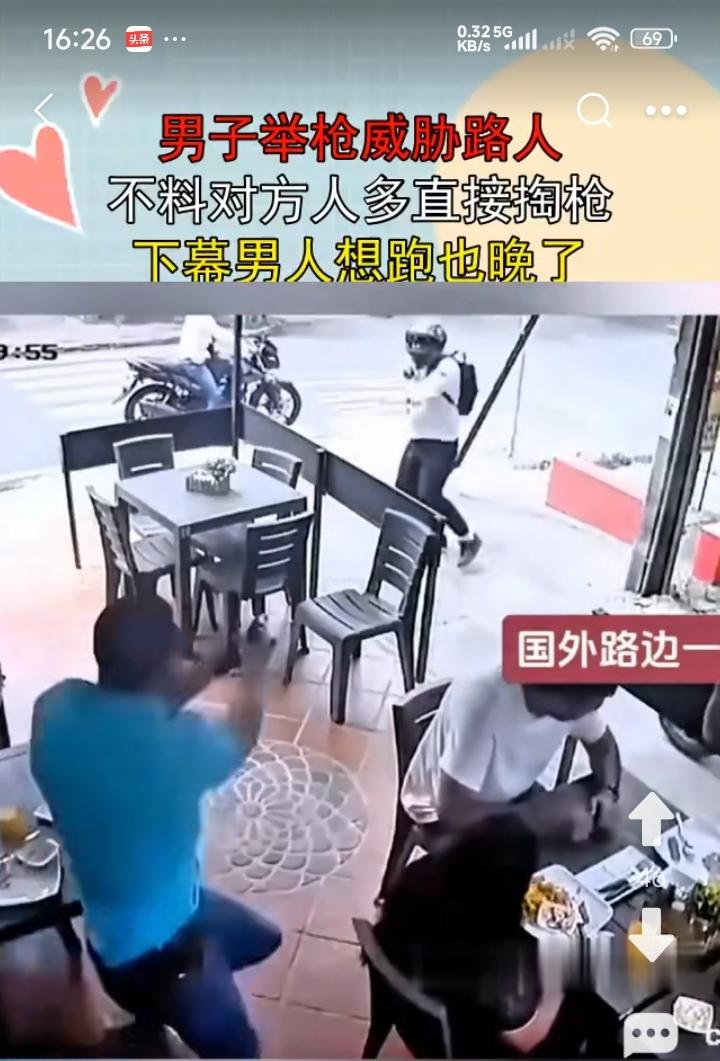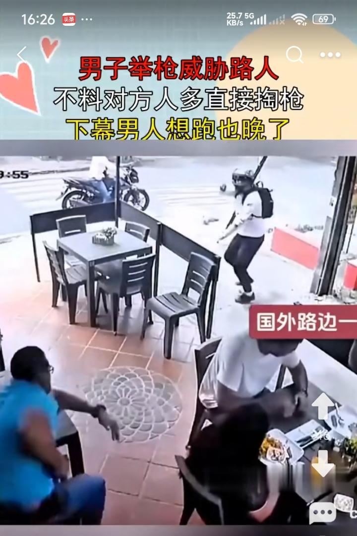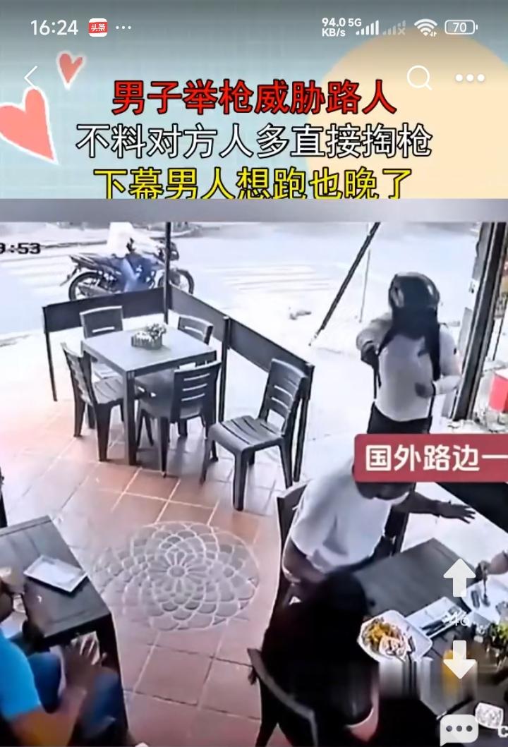 国外真的可怕。 一大叔正在路边小店吃饭,突然走进一个路人,用枪顶着他的头。 大叔吓坏了,不知道自己何时惹冒了太岁。 幸好这路人只是要钱不要命。 可另一座坐着用餐的大叔就不依了,从腰间拔出枪对着打劫的路人就是一阵biubiubiu输出。 可恨那小子,刚打劫到手的钱还没来得及花,便去见了阎王。 真的是国外乱不乱,真理说了算!