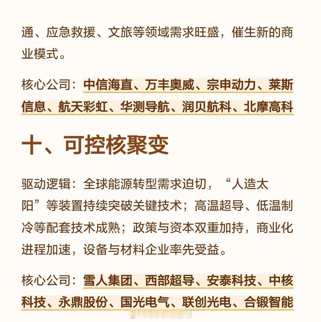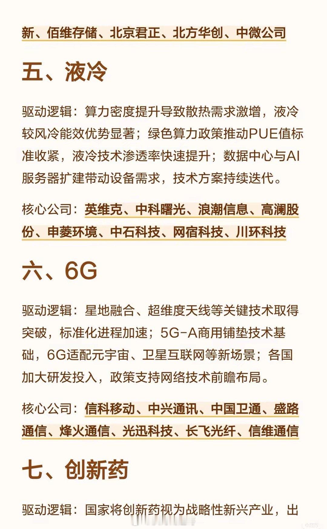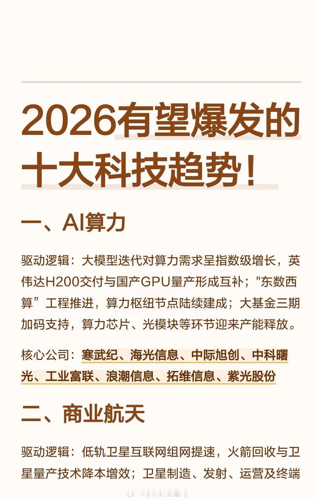 2026年有望爆发的十大科技趋势,涵盖AI算力、商业航天、人形机器人、存储芯片、液冷、6G、创新药、光刻机、低空经济、可控核聚变,每个趋势含驱动逻辑(如需求增长、技术突破、政策支持等)及核心公司名单(如AI算力的寒武纪、海光信息等)。
