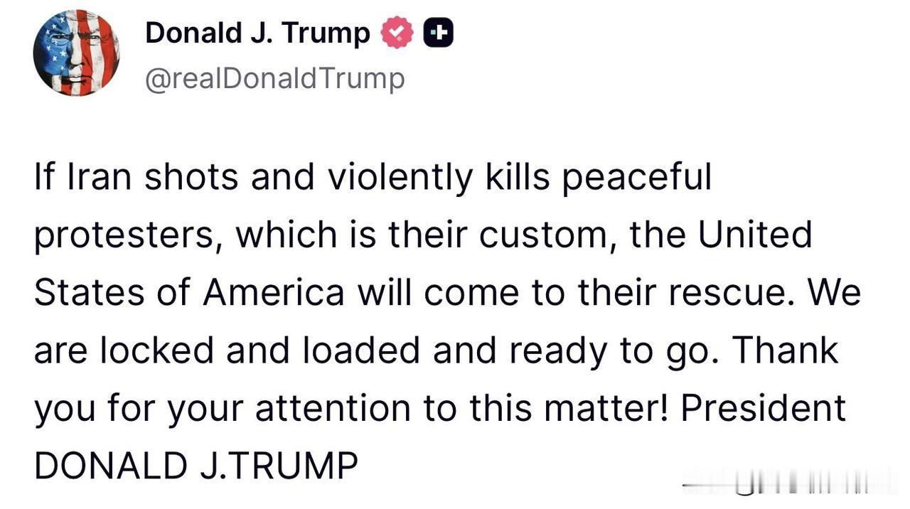 特朗普今天在社交平台发帖表示,如果伊朗枪击并暴力杀害和平示威者,美国将前来救援,并补充说:“我们已经全副武装,随时准备行动。” 这与他此前的国家战略自相矛盾。特朗普对乌克兰都不太愿意理睬,却声称已“全副武装”准备与伊朗开战,而讽刺的是,伊朗却得到了俄罗斯的支持。 年末岁初,伊朗爆发大规模抗议活动,起因于里亚尔汇率暴跌、通胀飙升至40%以上及生活成本急剧上涨。从德黑兰商家罢市开始,迅速蔓延全国多市,已致多人死亡,抗议者高喊反政府口号,要求结束伊斯兰共和国统治。 对流亡美国的伊朗王储巴列维来说,这是一条好消息,毕竟不少伊朗在在经过40多年的折腾之后,觉得原来他们推翻的巴列维国王还挺不错的。