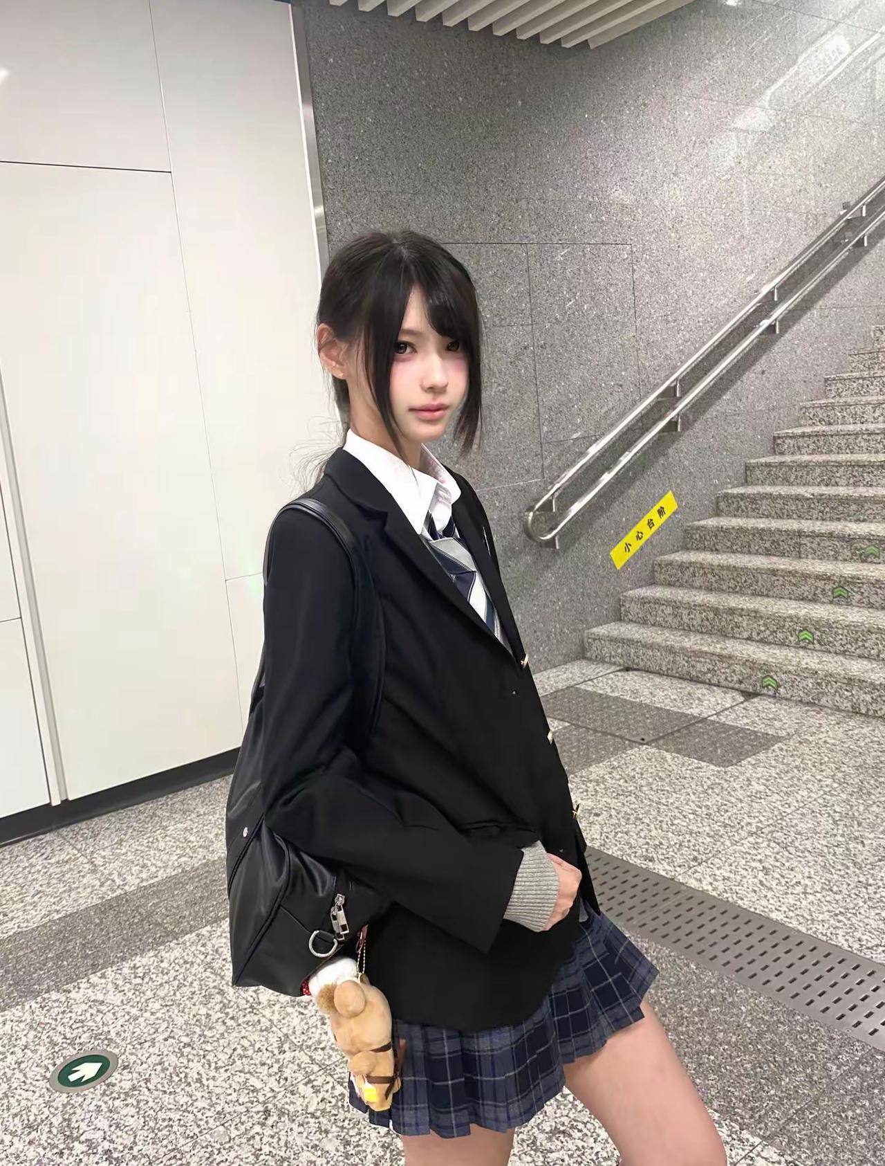 一个穿校服的女孩站在楼梯旁。青涩校服少女 校园里的小女孩 放学的女孩