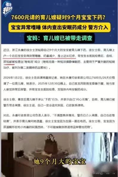 浙江永康,女子生了一龙凤胎,照顾不过来,就花7600元月薪找了一位育儿嫂,可自从这个育儿嫂上户之后,女子的孩子就出现了嗜睡,奶量减少的情况,后来她的男宝宝还直接昏迷不醒,她报了警,这才知道,育儿嫂给孩子下药了,居然给孩子喂安眠药,女子要追究育儿嫂的责任,育儿嫂却说自己问心无愧。 12月30日的晚上,徐女士回来,就想好好地陪一陪自己的一对龙凤胎,初为人母的她,不能时时刻刻地陪伴两个孩子的成长,她时常感到愧疚,每天一回来,她就想着多陪伴孩子。 可这晚她回到家,迎接她的不是孩子们的欢呼声,而是静悄悄的声音。 徐女士感到奇怪了,孩子们怎么那么早就睡了! 既然孩子睡着了,徐女士也想轻松,好好休息一下。 可她越休息越心慌,孩子们睡得实在太沉了,特别是男宝宝,叫都叫不醒,完全昏睡。 敏感的徐女士,马上意识到孩子的状态不对劲,这不是熟睡,而是昏睡了,吓得她赶紧将孩子送去医院。 结果一检查,就检查出孩子身体内,含有安眠药的成分。 孩子身上怎么可能有安眠药成分呢,事情太蹊跷了! 徐女士的脑袋里马上涌现出一个可怕的想法,那就是育儿嫂给孩子下药了。 她的这个想法可不是空穴来风,她是有依可循的。 为了照顾好两个宝宝,当初,徐女士就想着有更专业的人来帮忙照顾,这才每个月花7600元请育儿嫂。 自从这个月嫂来到他们家之后,两个宝宝乖得出奇,不但睡眠好了,喝奶也没有那么猛了。 一开始徐女士还以为,是育儿嫂照顾得比较周到,孩子才会睡眠质量好,因为睡得多,所以吃得就稍微少了一些。 但时间一长,孩子们的奶量减少了很多,她就觉得不正常了,并且孩子身上还出现了红疹子。 如今孩子身上,还检查出了有安眠药的成分,这一切都很明显,肯定是有人给孩子喂了安眠药。 谁会给孩子喂安眠药,徐女士和家人不可能会做这种伤害孩子身体的行为,唯一会干这种事的就是育儿嫂。 肯定是育儿嫂为了自己省事,给孩子喂安眠药,让孩子处于睡眠状态,她也就轻松了。 想到这里,徐女士震惊了,育儿嫂很有可能是会干这种事情,她质问育儿嫂,但是育儿嫂否认了,还说自己照顾孩子,问心无愧。 徐女士怎么可能听育儿嫂的一面之词,事关孩子的身体健康,她要弄明白,这到底是怎么一回事,她报了警。 面对民警的询问,育儿嫂说,徐女士的孩子本来身体就有问题,一直在吃药,说不定是药里面就有这种成分。 徐女士马上解释说,自己的孩子,确实一直在吃药,但是孩子吃的药里面,是没有这个成分的。 事情已经很明显,这件事很有可能就是保姆给孩子喂了安眠药,若真是如此,育儿嫂可真是蛇蝎心肠啊! 不是自己的孩子不懂得心疼,育儿嫂为了让自己工作轻松,不惜下药伤害孩子的身体。 可怜的孩子,才9个月大,天天被喂安眠药,这对孩子,将会造成了很大的身体伤害。 育儿嫂只是想着自己轻松,她对待孩子的手段,不是图省事这么简单的。 她非常清楚自己的行为,会给孩子造成多大的伤害,她依然选择这种手段来伤害孩子,这是一个人的人品问题,这种人不适合当育儿嫂,她的存在只会伤害更多的孩子。 徐女士遇到这样的育儿嫂,自然不能轻易放过她,她的行为或许会给孩子带来不可逆的伤害,一定要追究她的责任。 那么徐女士该怎么办呢? 首先,育儿嫂知道自己的行为,会给孩子带来伤害,她依然选择做这样的事情,她的行为已经构成了故意伤害行为。 《治安管理处罚法》第49条规定:盗窃、诈骗、哄抢、抢夺、敲诈勒索或者故意损毁公私财物的,处五日以上十日以下拘留,可以并处五百元以下罚款;情节较重的,处十日以上十五日以下拘留,可以并处一千元以下罚款。 如果育儿嫂的行为给孩子带来非常大的伤害,那么她的行为不只是违法这么简单,将会构成故意伤害罪。 其次,育儿嫂给孩子造成的人身损害,她需要赔偿。 《民法典》第1179条规定:侵害他人造成人身损害 的,应当赔偿医疗费,护理费,交通费,营养费,住院伙食补助费等为治疗和康复支出的合理费用,以及因误工减少的收入。造成残疾的,还应当赔偿辅助器具费和残疾赔偿金;造成死亡的,还应当赔偿丧葬费和死亡赔偿金。 9个月大的孩子,如果长期被喂安眠药,其伤害可想而知。 遇到这样的育儿嫂,就应当追究她的责任。 那么你对这样的育儿嫂有何看法呢?