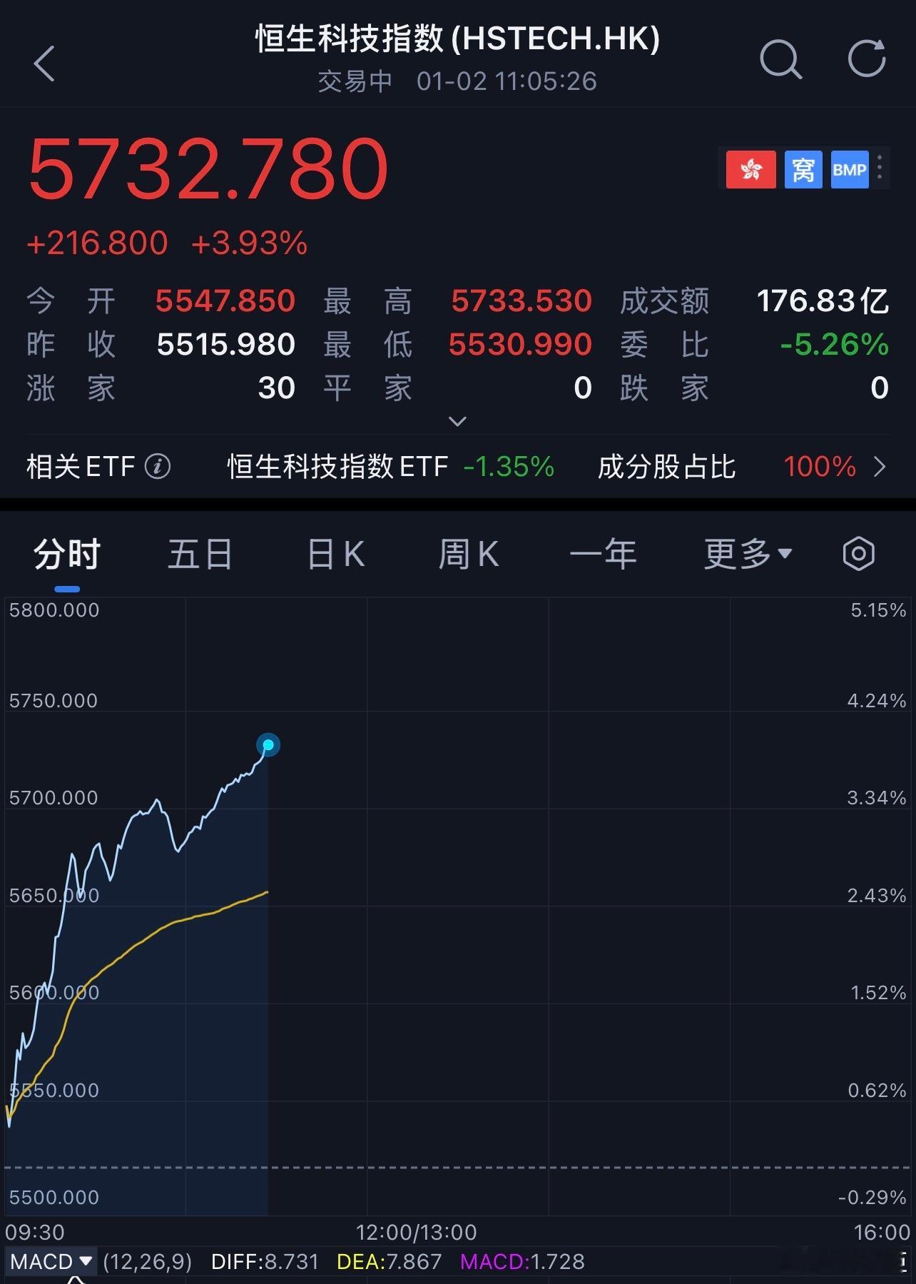 今天恒生科技怎么个事???2026年开门红???港股恒生科技 港股今日全线大涨