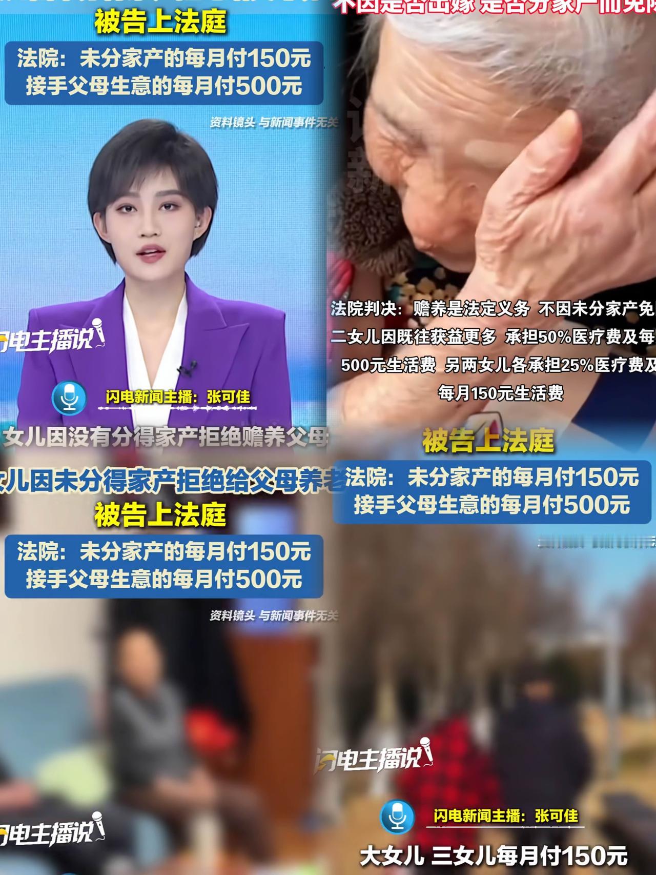 镇江句容一对老夫妻把俩出嫁女儿告上法庭要赡养费,这事儿可太让人唏嘘了!大女儿和小女儿觉得父母偏心,财产都给了二女儿,自己没分到就不该养老。 可法院判决却明确,赡养是法定强制责任,不能因出嫁、财产分配等免除。 不过考虑到二女儿长期和老人生活,接手生意,所以她多承担些,俩出嫁女儿也需分担。 这判决太合理了!赡养父母怎能和财产挂钩,那是血浓于水的亲情啊!父母养大我们不容易,年老体弱时我们怎能因“理由”就逃避责任? 同时这也给父母提了个醒,公平是亲情基石,偏爱会伤孩子心,破坏家庭和谐,还可能让自己老无所依。 大家觉得这判决咋样?要是你遇到这种事会怎么做?