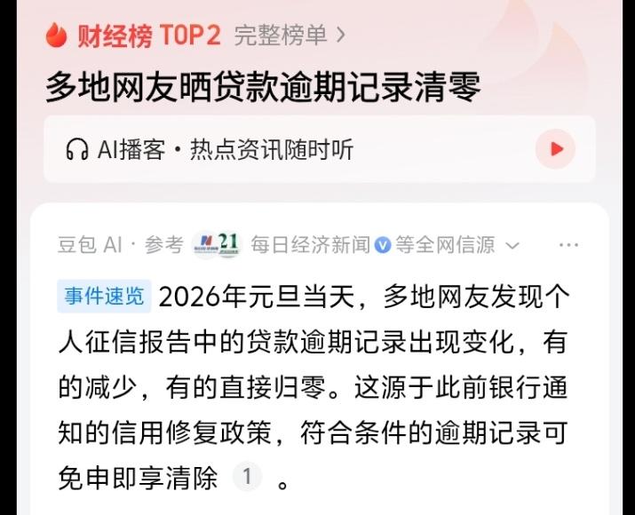 2026年元旦,千万人征信“悄悄”刷新!你的逾期记录被清零了吗?上海、广东、广西网友亲述背后真相与争议 元旦清晨的阳光照进上海白先生的出租屋,他习惯性打开手机查询个人征信报告,却瞬间愣住了——那条纠缠他47个月的网贷逾期记录,竟无声无息地消失了。他揉了揉眼睛,反复刷新页面,确认不是系统故障。与此同时,广东的于女士、广西的刘先生也在社交平台晒出截图,惊呼自己的征信报告“一夜变干净”。这场席卷全国的信用记录变化,并非偶然,而是一场悄然落地的政策调整。 据中国人民银行2025年底发布的通知,为缓解疫情对个人信用的长期影响,对2020年至2025年间单笔本金不超过1万元的逾期记录,若用户在2026年3月31日前还清欠款,系统将自动清除逾期展示,且无需主动申请。政策本意是为小额负债者提供“重生机会”,但实际执行中却像一场静默的数字魔法,有人惊喜,有人困惑,更有人质疑。 广西刘先生的征信报告上,9条逾期记录消失了7条,留下的两笔中,一笔金额超过3.5万元,另一笔金额未显示。他猜测系统可能只对“万元以下”的债务网开一面,但规则模糊得像雾里看花。广东蔡先生则发现,自己还清的11笔逾期中,有一笔因本金加罚息可能超过一万元,仍被记录在案。他联系客服,只得到“系统自动判定”的答复,这让他感到无奈:“钱都还了,诚意却换不来系统的‘谅解’。” 更让许多人困惑的是,信用卡逾期似乎未被纳入此次清理范围。有网友抱怨,自己只是因临时资金周转困难导致信用卡逾期,却未能享受政策红利。而学生贷、医美贷等高频小额贷款,虽符合金额门槛,但系统机械的判定方式,反而让那些努力还款却因利息累积超标的人感到不公。这场“信用修复”更像一场数字游戏,规则写在暗处,普通人只能被动等待结果。 政策设计者或许怀着善意,希望帮助那些真实还款却背负历史包袱的人轻装上阵。但执行中的“一刀切”与不透明,却让这场好事蒙上阴影。有网友调侃:“这是系统给普通人开的一道‘后门’,但钥匙藏在算法里,谁也摸不着。”更有人尖锐指出,逾期记录只是“隐藏”而非“删除”,银行内部是否仍可查看?未来贷款审核是否会区别对待?这些问题像悬在头顶的达摩克利斯之剑。 从社会层面看,这场征信调整折射出当代人对“信用焦虑”的集体共鸣。在消费主义与借贷经济裹挟下,无数人因房贷、网贷、信用卡陷入债务漩涡,征信报告上的数字成了压在心头的巨石。政策的出台,像一束照进暗室的光,让部分人得以喘息,但也照见了系统性问题的复杂——如果信用修复仅靠技术调整,而非从根本上改善金融包容性与债务管理机制,那么“清零”或许只是暂时的安慰。 网友的评论区早已沸腾。有人感叹“赶上好时候”,终于能安心申请房贷;有人自嘲“白高兴一场”,因为大额债务依然无解;也有人冷静提醒:“还清的钱才是自己的,征信只是表象。”更有负债者分享经历,称自己仍在送外卖还债,但“不再怕催收与起诉”。这些声音交织成一幅真实的社会图景,其中既有希望,也有无奈,更有对公平与透明的渴求。 这场静悄悄的征信变革,最终指向一个核心命题:信用体系的本质,究竟是惩戒过去的错误,还是鼓励未来的诚信?当技术能“抹去”记录,我们是否也应思考如何减少逾期的发生?或许,比清理历史数据更重要的,是构建更人性化的金融支持网络,让普通人不必因一时困顿而付出长达数年的信用代价。 元旦的钟声已经远去,征信报告上的数字变化或许只是人生中的一个小插曲。但它提醒我们,在数字时代,每个人的信用都是一张流动的名片,既需要制度给予修复的缝隙,更需要个体珍惜每一次履约的承诺。毕竟,真正的“清零”不在系统里,而在我们从容应对生活的底气之中。 (来源:综合每日经济新闻、央行通知及多地网友社交平台反馈) 征信清零 信用修复