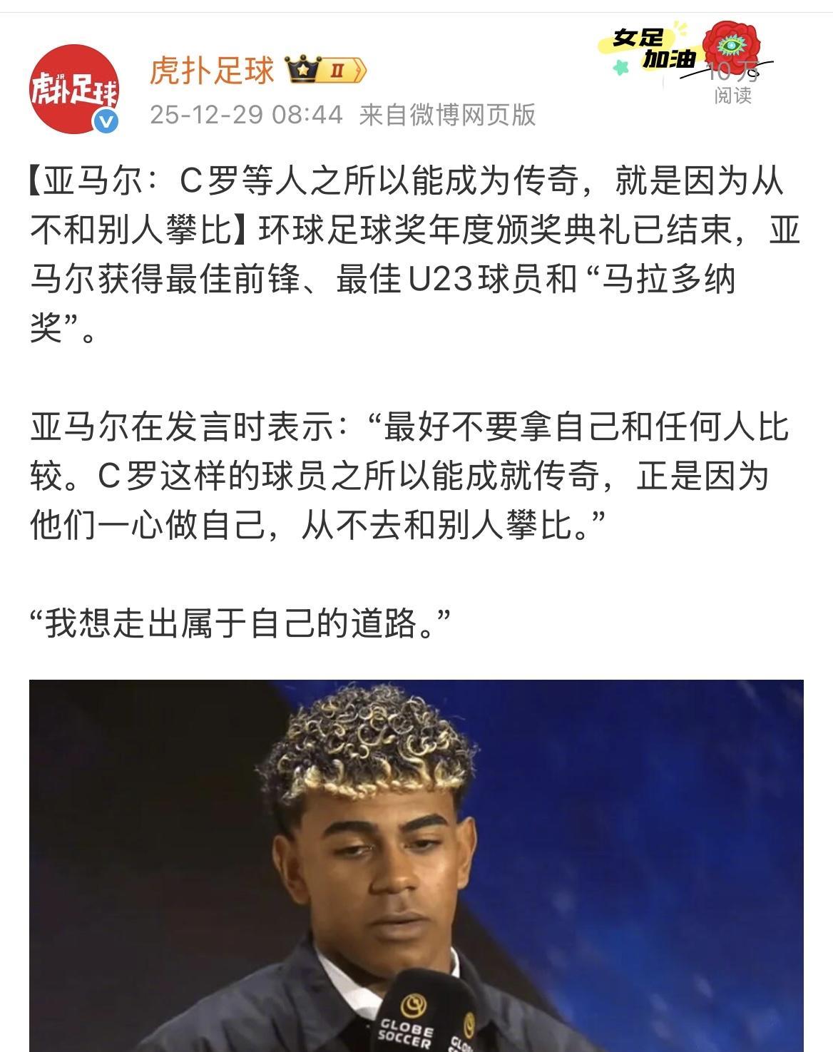 环球奖颁奖典礼,亚马尔获得最佳前锋、最佳U23球员和马拉多纳奖。他在发言时表示:“不要拿自己和任何人比较。C罗这样的球员之所以能成就传奇,正是因为他们一心做自己,从不去和别人攀比。” 但C罗不止一次宣称:我是历史第一第二第三,比梅西、贝利和马拉多纳都要强。 这叫一心做自己? 如此明目张胆歪曲事实,就因为C罗给他发了三个奖?还是在阴阳怪气说反话?