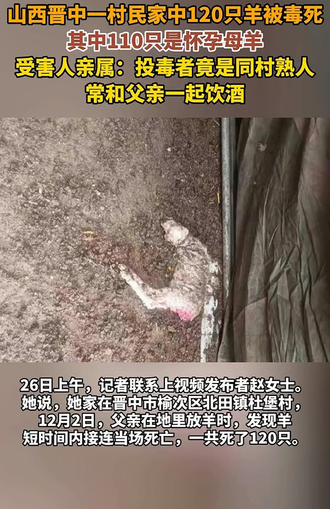 山西晋中,一女子家里养了200只羊,一天,她的父亲去地里放羊,却发现羊突然接二连三地死亡。 死了120只,其中110只都是怀孕的母羊,经过警方调查,确认是有人投毒,而投毒者竟是经常和女子父亲一起喝酒的同村熟人! 这起投毒案发生在山西晋中一个偏远村落,涉事女子姓郭,和父母一起以养殖山羊为生,200只羊是家里全部的经济来源,支撑着全家的生计和郭女士的婚事筹备。 郭女士的父亲老郭今年58岁,养羊已有十几年,经验丰富,平日里对羊群悉心照料,每天天不亮就赶着羊群去村外的山坡放牧,傍晚再安全赶回羊圈。 事发当天清晨,老郭像往常一样赶着羊群上山,羊群刚散开觅食没多久,就有几只羊突然倒地抽搐,口吐白沫,没过几分钟就没了气息。 老郭心里一紧,连忙上前查看,还没等他弄清楚状况,又有十几只羊陆续出现同样症状,接二连三地倒地死亡,现场惨不忍睹。 他慌了神,一边吆喝着聚拢剩余羊群,一边掏出手机给女儿和老伴打电话,声音里满是焦急和颤抖。 郭女士接到电话后,立刻和母亲赶往山坡,看到满地死去的羊只,母女俩当场红了眼,郭女士强忍着悲痛,仔细清点死亡数量,一共120只,其中110只都是即将产仔的母羊。 这些怀孕母羊是家里的“希望”,再过不久就能产下小羊羔,壮大养殖规模,如今一夜之间惨死,对这个普通家庭来说,无疑是灭顶之灾。 老郭瘫坐在地上,反复检查羊群的饲料和周边草地,没发现明显异常,他怀疑羊群是误食了有毒植物,可又觉得短时间内大量死亡,绝非偶然。 郭女士越想越不对劲,果断拨打了110报警电话,怀疑有人故意投毒,同时联系了当地畜牧部门,请求专业人员前来检测。 警方接到报警后,迅速赶到现场,联合畜牧部门工作人员展开调查,畜牧专家对死亡羊只进行初步检测,从羊只的呕吐物和胃内容物中,检出了有机磷农药成分,确认是人为投毒所致。 为了锁定投毒者,民警对案发现场及周边区域进行细致勘查,调取了村口及附近道路的监控录像,同时对同村村民展开走访排查。 走访中,民警了解到,老郭为人老实本分,平时和村民相处和睦,唯独前段时间,和同村男子王某因放羊边界问题发生过争执。 王某和老郭年纪相仿,也是村里的养殖户,两人平时关系不错,经常一起喝酒聊天,互相照看羊群,可那次争执后,两人便心生隔阂,不再来往。 民警将王某列为重点怀疑对象,对其进行传唤询问,王某起初矢口否认,坚称自己没有投毒,还表示和老郭只是小矛盾,不至于做出这种事。 可当民警拿出调查证据——案发前一天傍晚,王某曾出现在老郭羊群常放牧的山坡附近,且有人看到他手里拿着一个黑色塑料袋,同时在王某家中搜出了同款有机磷农药的空瓶时,王某的心理防线彻底崩溃。 他如实供述了自己的投毒行为,承认是因为放羊边界纠纷怀恨在心,想报复老郭,毁掉他的羊群。 王某说,上次争执后,他心里一直憋着气,看着老郭的羊群越来越壮大,嫉妒心和怨恨感交织在一起,便动了投毒的念头。 他提前购买了有机磷农药,趁着傍晚无人,偷偷将农药喷洒在老郭羊群常觅食的草地和饮水处,以为神不知鬼不觉,既能报复老郭,又能掩盖自己的罪行。 得知自己投毒导致120只羊死亡,其中大部分是怀孕母羊时,王某也露出了懊悔的神情,可事已至此,再无挽回余地。 经相关部门评估,老郭家中因羊只死亡造成的经济损失高达30余万元,这笔巨额损失让本就不富裕的家庭雪上加霜。 检察机关审查案件后,认为王某因民间纠纷,故意投放有毒物质,破坏他人财物,造成重大经济损失,犯罪情节严重,依法以涉嫌故意毁坏财物罪对其提起公诉。 法院开庭审理此案时,充分考量了案件起因、王某的犯罪情节、认罪态度及造成的经济损失。 王某当庭认罪认罚,主动向老郭一家道歉,请求谅解,并表示愿意尽自己所能赔偿损失,可因其家庭条件有限,仅能拿出少量资金赔偿,无法弥补老郭一家的全部损失。 最终,法院综合全案事实与证据,依法判处王某有期徒刑五年,并责令其赔偿老郭一家经济损失30余万元。 判决生效后,王某被送往监狱服刑,为自己的冲动和报复行为付出了沉重代价。 老郭一家虽然拿到了判决书,却再也回不来那些死去的羊只,家里的养殖事业一度停滞,郭女士的婚事也被迫推迟。 在村干部和亲友的帮助下,老郭一家筹集了部分资金,重新购买了一批小羊羔,慢慢恢复养殖,可想起那场灾难,心里依旧满是伤痛。 同村村民得知此事后,都深感惋惜,纷纷表示,邻里之间难免有矛盾,遇事本该冷静协商解决,王某却因一时怨恨,做出投毒报复的蠢事,不仅毁了别人的家庭,也葬送了自己的人生。 信源:山西晋中惊现"毒友":村民120只羊被毒死,凶手竟是父亲好友事后登门假意安慰-新黄河