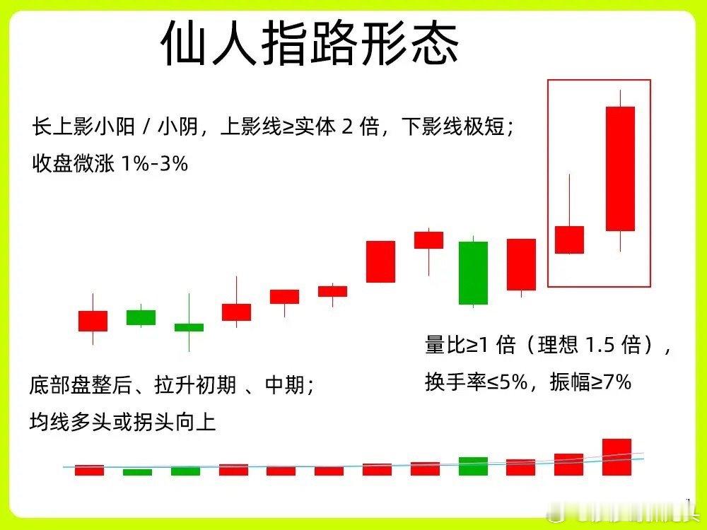 主力在启动拉升之前,都会做一个动作,那就是试盘,而在主力试盘的过程里,出现最多的形态就仙人指路,也就是长上影线试盘。其他很多人对这个形态有误解,不是所有长上影线都是试盘线。主力试盘其实会在所有阶段都会去试盘,主力测试下方的承接力量也会测试上方抛压情况,而仙人指路形态注意是测试上方抛压,来决定是否继续洗盘仙人指路形态和射击之星形态类型,主要在分时图里的表现和股价位置。仙人指路形态,一般会在股价低位横盘阶段或是上涨趋势的初期出现,在分时图里,股价会在早盘出现放量冲击波,股价出现快速拉升,但是没有出现涨停,一般涨幅会在7%左右。随后股价开始缓慢下跌,最终会以小幅上涨收盘,在日K线里就会形成一个长上影线的K线,实体部分很小,上影线很长,一般会是实体部分的两倍以上。阴线就没阳线那么强在分时图里,如果此时抛压比较小,就会出现缩量下跌,承接力量比较强。如果此时抛压比较大,就会出现放量下跌,那后市往往就会继续洗盘。这就是试盘线,判断主力是否试盘成功,那次日的阳线就比较重要,现在知道仙人指路形态是什么逻辑了吧!