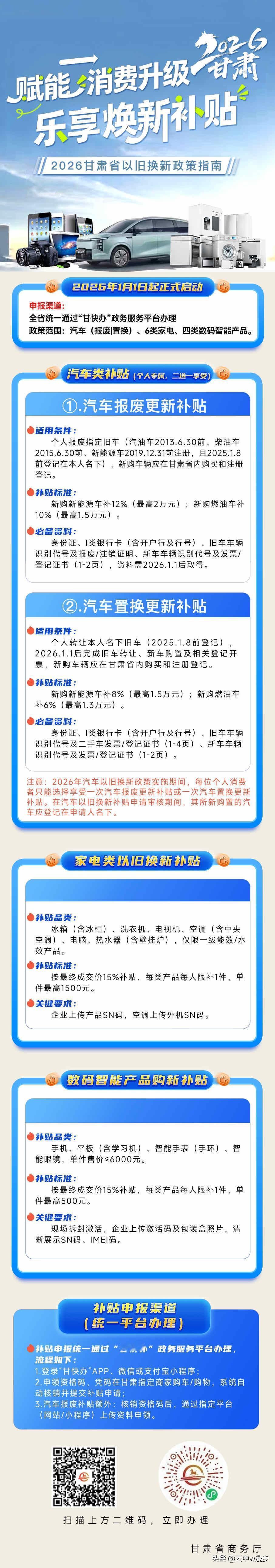 甘肃人注意啦! 甘肃2026年消费品以旧换新补贴政策自1月1日起正式实施,汽车
